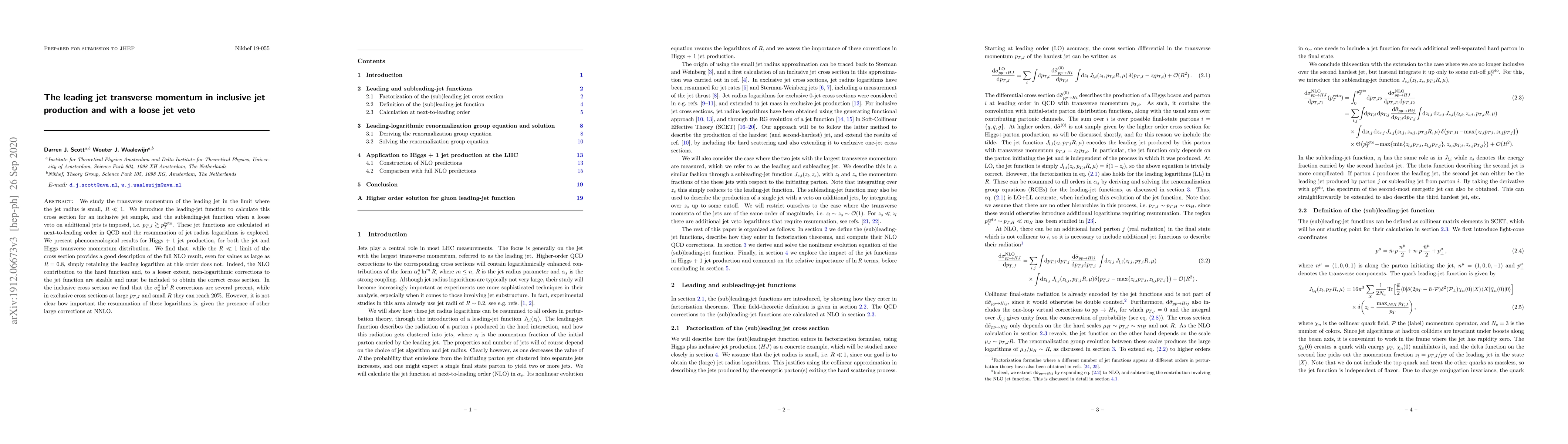 We study the transverse momentum of the leading jet in the limit where the jet radius is small, $R\ll 1$. We introduce the leading-jet function to calculate this cross section for an inclusive jet sample, and the subleading-jet function when a loose veto on additional jets is imposed, i.e. $p_{T,J} \gtrsim p_T^{\rm veto}$. These jet functions are calculated at next-to-leading order in QCD and the resummation of jet radius logarithms is explored. We present phenomenological results for Higgs + 1 jet production, for both the jet and Higgs transverse momentum distribution. We find that, while the $R \ll 1$ limit of the cross section provides a good description of the full NLO result, even for values as large as $R=0.8$, simply retaining the leading logarithm at this order does not. Indeed, the NLO contribution to the hard function and, to a lesser extent, non-logarithmic corrections to the jet function are sizable and must be included to obtain the correct cross section. In the inclusive cross section we find that the $\alpha_s^2 \ln^2R$ corrections are several precent, while in exclusive cross sections at large $p_{T,J}$ and small $R$ they can reach 20%. However, it is not clear how important the resummation of these logarithms is, given the presence of other large corrections at NNLO.