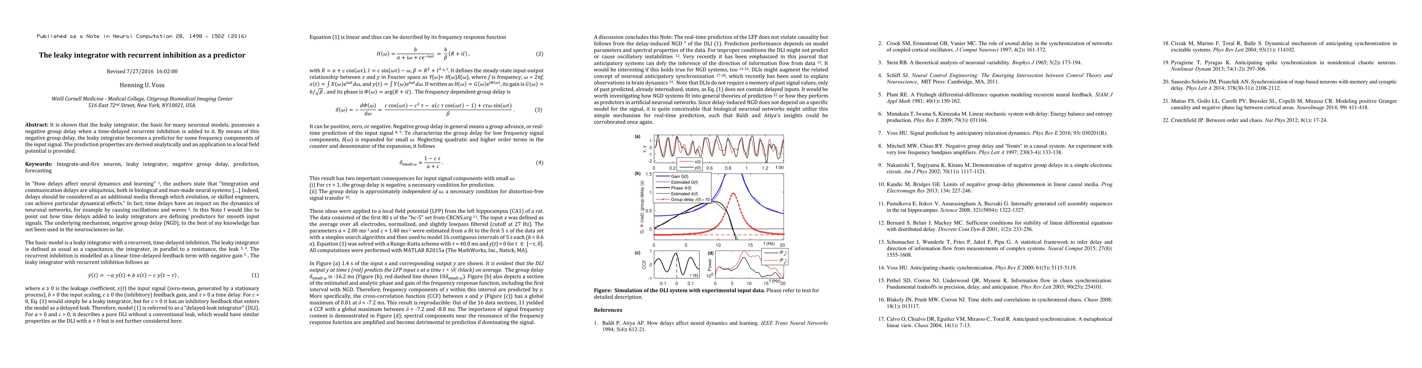 It is shown that the leaky integrator, the basis for many neuronal models, possesses a negative group delay when a time-delayed recurrent inhibition is added to it. By means of this negative group delay, the leaky integrator becomes a predictor for some frequency components of the input signal. The prediction properties are derived analytically and an application to a local field potential is provided.