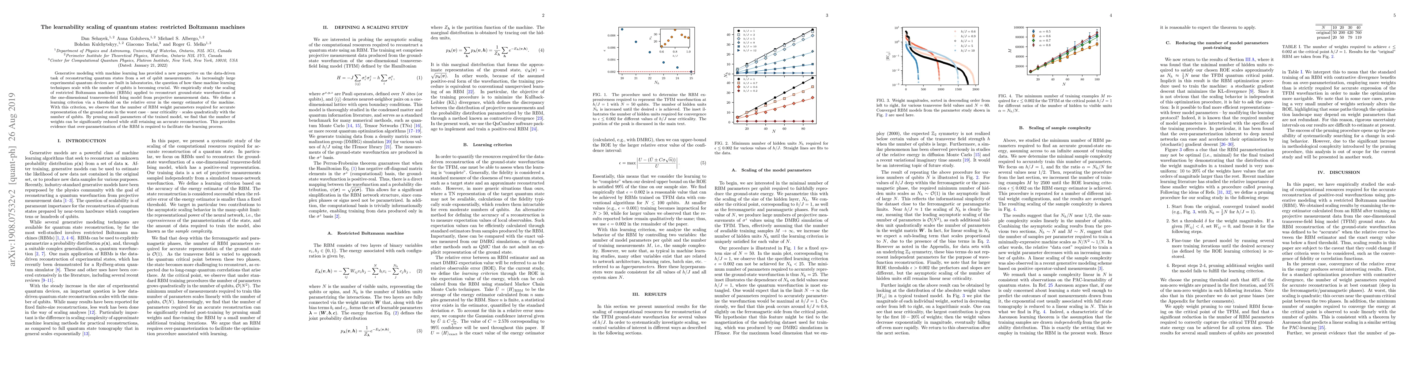 This paper investigates how restricted Boltzmann machines (RBMs) scale for reconstructing quantum states from qubit measurements, finding that the number of weight parameters required scales quadratically with the number of qubits. Pruning small parameters allows for significant reduction while maintaining accuracy, indicating over-parametrization aids the learning process.