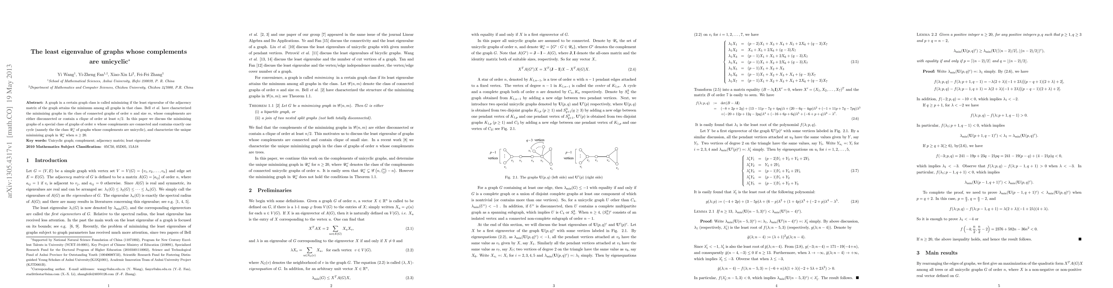 A graph in a certain graph class is called minimizing if the least eigenvalue of the adjacency matrix of the graph attains the minimum among all graphs in that class. Bell {\it et al.} have characterized the minimizing graphs in the class of connected graphs of order $n$ and size $m$, whose complements are either disconnected or contain a clique of order at least $n/2$. In this paper we discuss the minimizing graphs of a special class of graphs of order $n$ whose complements are connected and contains exactly one cycle (namely the the class $\mathscr {U}^{c}_{n}$ of graphs whose complements are unicyclic), and characterize the unique minimizing graph in $\mathscr {U}^{c}_{n}$ when $n \geq 20$.