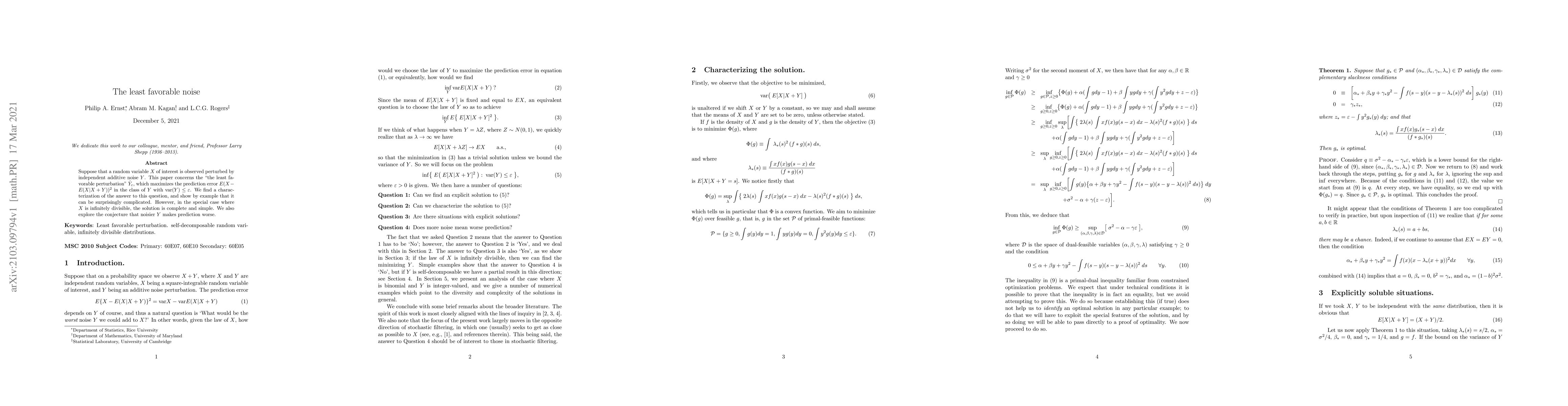 Suppose that a random variable $X$ of interest is observed perturbed by independent additive noise $Y$. This paper concerns the "the least favorable perturbation" $\hat Y_\ep$, which maximizes the prediction error $E(X-E(X|X+Y))^2$ in the class of $Y$ with $ \var (Y)\leq \ep$. We find a characterization of the answer to this question, and show by example that it can be surprisingly complicated. However, in the special case where $X$ is infinitely divisible, the solution is complete and simple. We also explore the conjecture that noisier $Y$ makes prediction worse.