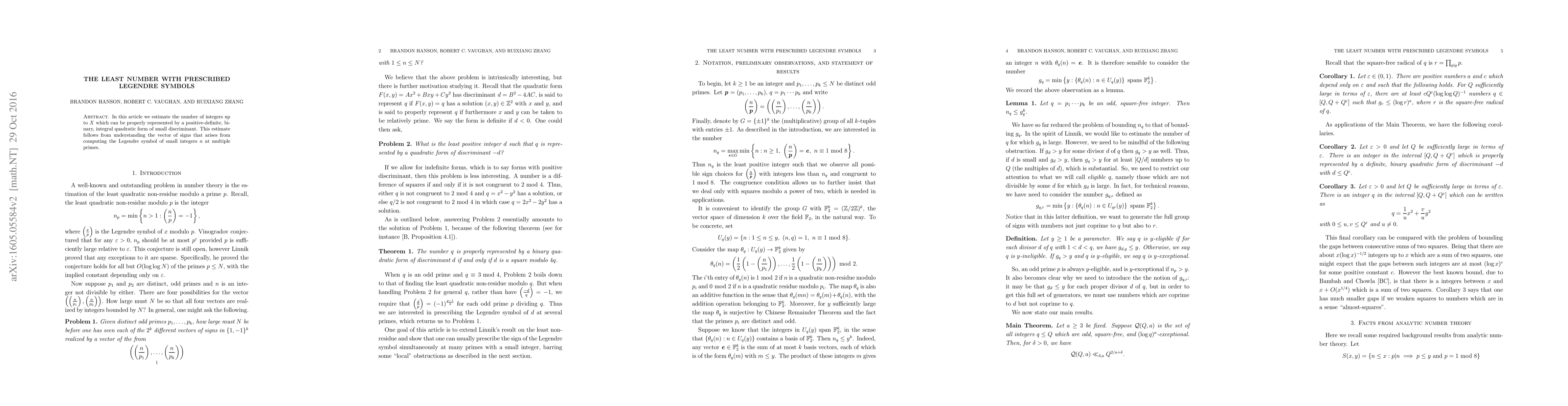 In this article we estimate the number of integers up to $X$ which can be represented by a positive-definite, binary integral quadratic form of discriminant which is small relative to $X$. This follows from understanding the vector of signs when computing the Legendre symbol of small integers $n$ at multiple primes.
