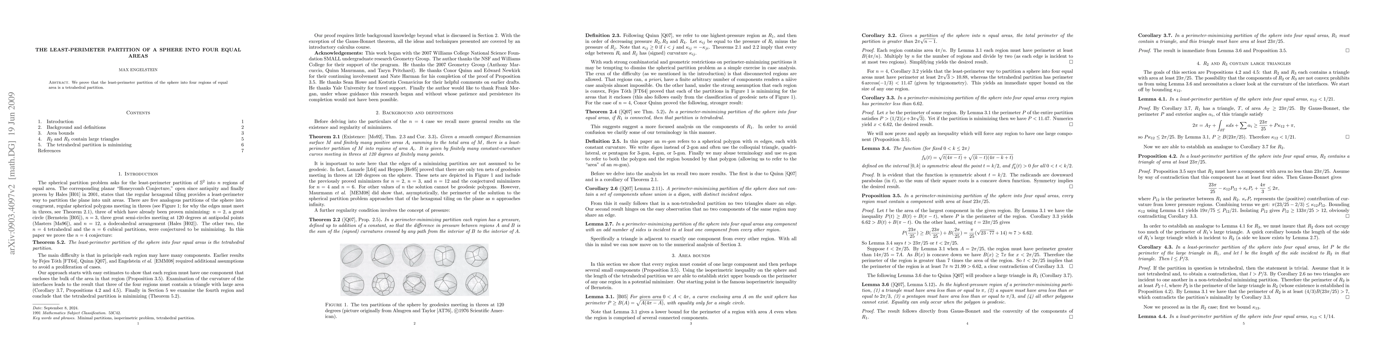 Summary: This paper proves that the configuration requiring the least perimeter to partition a sphere into four regions of equal area is a tetrahedral division. The study demonstrates the optimality of this geometric arrangement.