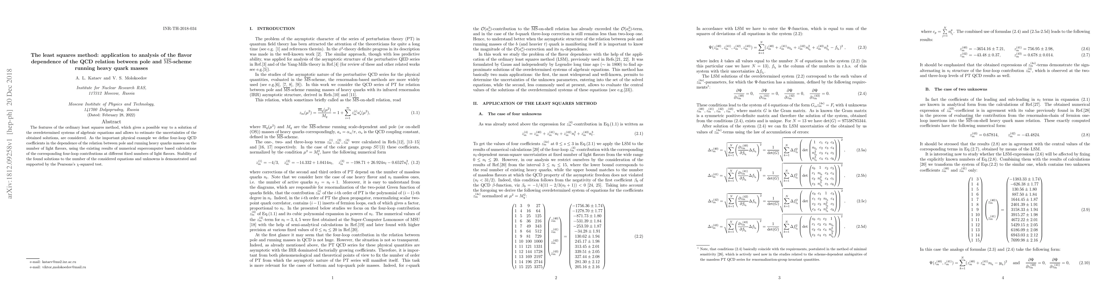 Researchers applied the least squares method to analyze how the QCD relation between pole and “MS”-scheme running heavy quark masses depend on the number of light flavors, finding stable solutions with high accuracy.
