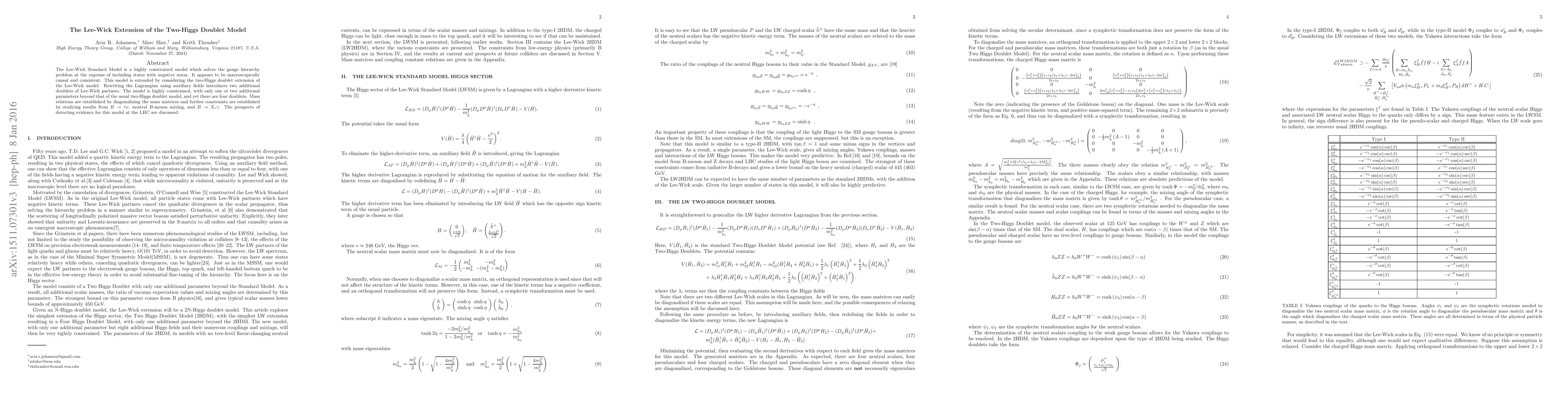 The Lee-Wick Standard Model is a highly constrained model which solves the gauge hierarchy problem at the expense of including states with negative norm. It appears to be macroscopically causal and consistent. This model is extended by considering the two-Higgs doublet extension of the Lee-Wick model. Rewriting the Lagrangian using auxiliary fields introduces two additional doublets of Lee-Wick partners. The model is highly constrained, with only one or two additional parameters beyond that of the usual two-Higgs doublet model, and yet there are four doublets. Mass relations are established by diagonalizing the mass matrices and further constraints are established by studying results from B --> tau nu, neutral B-meson mixing, and B --> X_s gamma. The prospects of detecting evidence for this model at the LHC are discussed.