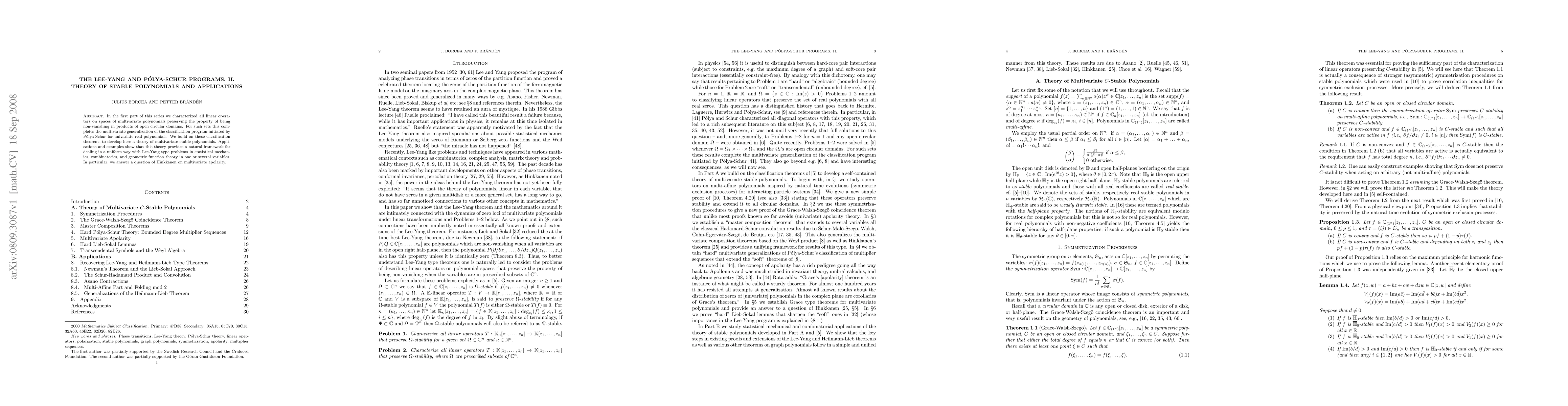 This paper extends the classification of multivariate polynomials that remain non-vanishing in open circular domains, establishing a theory of multivariate stable polynomials. This framework is applied to address Lee-Yang problems across statistical mechanics, combinatorics, and geometric function theory.