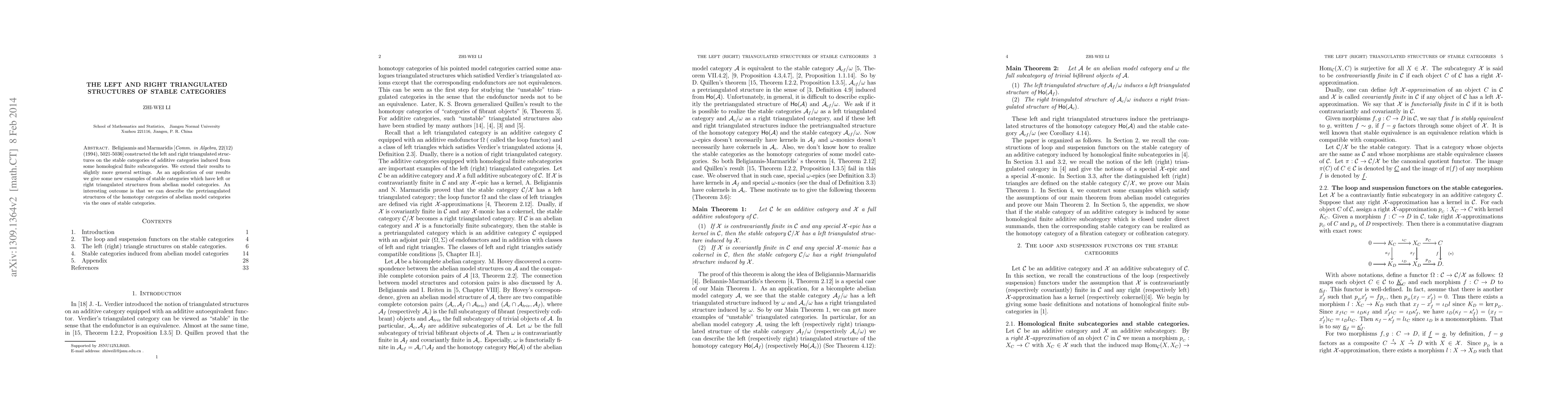 Beligiannis and Marmaridis [\emph{Comm. in Algebra,} 22(12)(1994), 5021-5036] constructed the left and right triangulated structures on the stable categories of additive categories induced from some homological finite subcategories. We extend their results to slightly more general settings. As an application of our results we give some new examples of stable categories which have left or right triangulated structures from abelian model categories. An interesting outcome is that we can describe the pretriangulated structures of the homotopy categories of abelian model categories via the ones of stable categories.