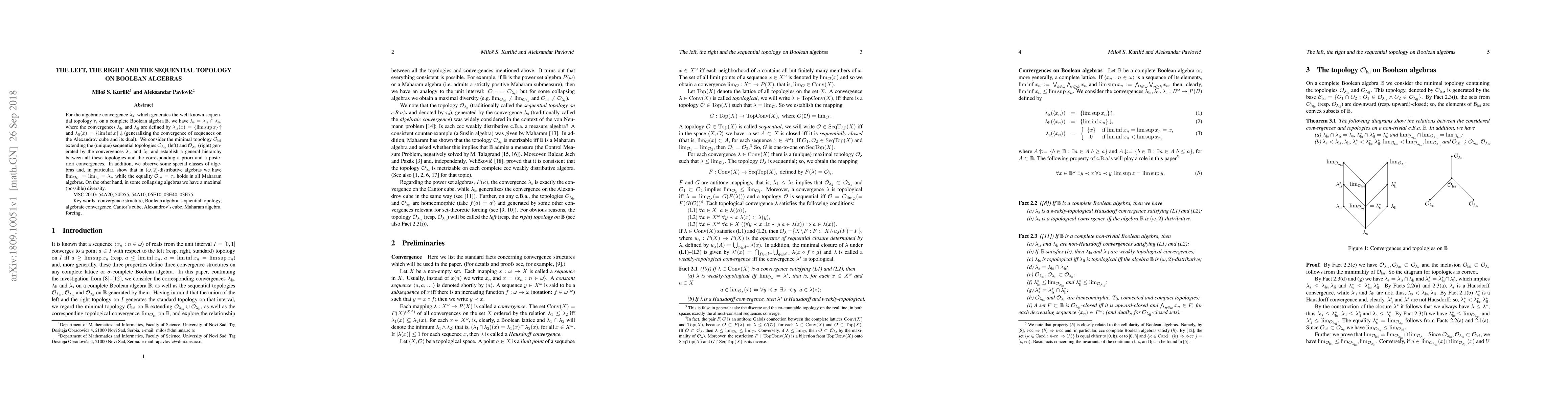 For the algebraic convergence $\lambda_{\mathrm{s}}$, which generates the well known sequential topology $\tau_s$ on a complete Boolean algebra ${\mathbb B}$, we have $\lambda_{\mathrm{s}}=\lambda_{\mathrm{ls}}\cap \lambda_{\mathrm{li}}$, where the convergences $\lambda_{\mathrm{ls}}$ and $\lambda_{\mathrm{li}}$ are defined by $\lambda_{\mathrm{ls}}(x)=\{ \limsup x\}\!\uparrow$ and $\lambda_{\mathrm{li}}(x)=\{ \liminf x\}\!\downarrow$ (generalizing the convergence of sequences on the Alexandrov cube and its dual). We consider the minimal topology $\mathcal{O}_{\mathrm{lsi}}$ extending the (unique) sequential topologies $\mathcal{O}_{\lambda_{\mathrm{ls}}}$ (left) and $\mathcal{O}_{\lambda_{\mathrm{li}}}$ (right) generated by the convergences $\lambda_{\mathrm{ls}}$ and $\lambda_{\mathrm{li}}$ and establish a general hierarchy between all these topologies and the corresponding a priori and a posteriori convergences. In addition, we observe some special classes of algebras and, in particular, show that in $(\omega,2)$-distributive algebras we have $\lim_{{\mathcal O}_{\mathrm{lsi}}}=\lim_{\tau _{\mathrm{s}} }=\lambda _{\mathrm{s}}$, while the equality $\mathcal{O}_{\mathrm{lsi}}=\tau_s$ holds in all Maharam algebras. On the other hand, in some collapsing algebras we have a maximal (possible) diversity.