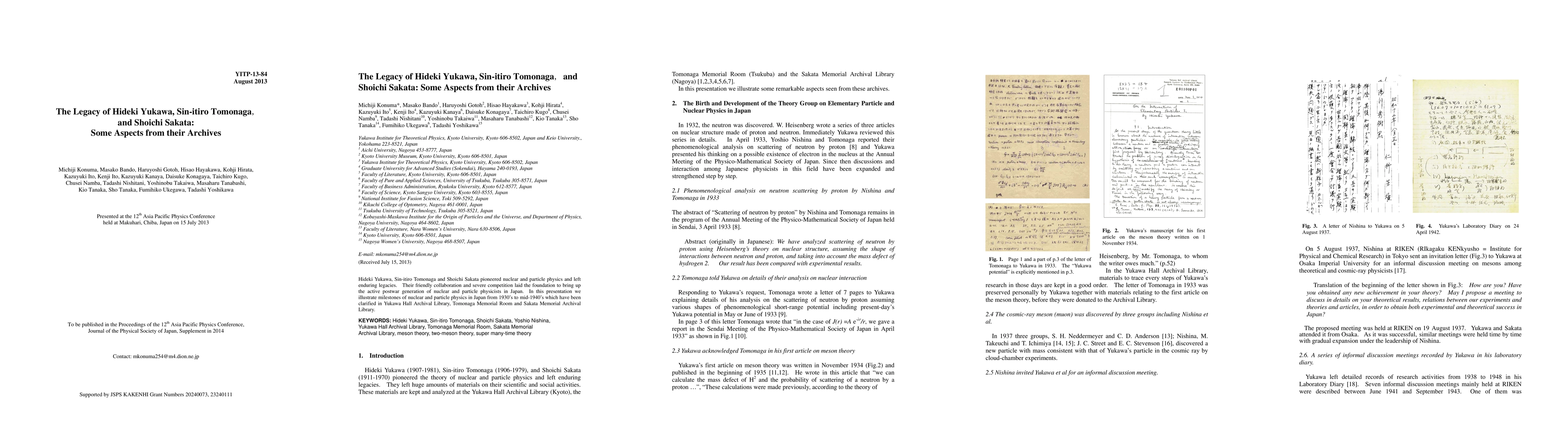 Hideki Yukawa, Sin-itiro Tomonaga and Shoichi Sakata pioneered nuclear and particle physics and left enduring legacies. Their friendly collaboration and severe competition laid the foundation to bring up the active postwar generation of nuclear and particle physicists in Japan. In this presentation we illustrate milestones of nuclear and particle physics in Japan from 1930's to mid-1940's which have been clarified in Yukawa Hall Archival Library, Tomonaga Memorial Room and Sakata Memorial Archival Library.
