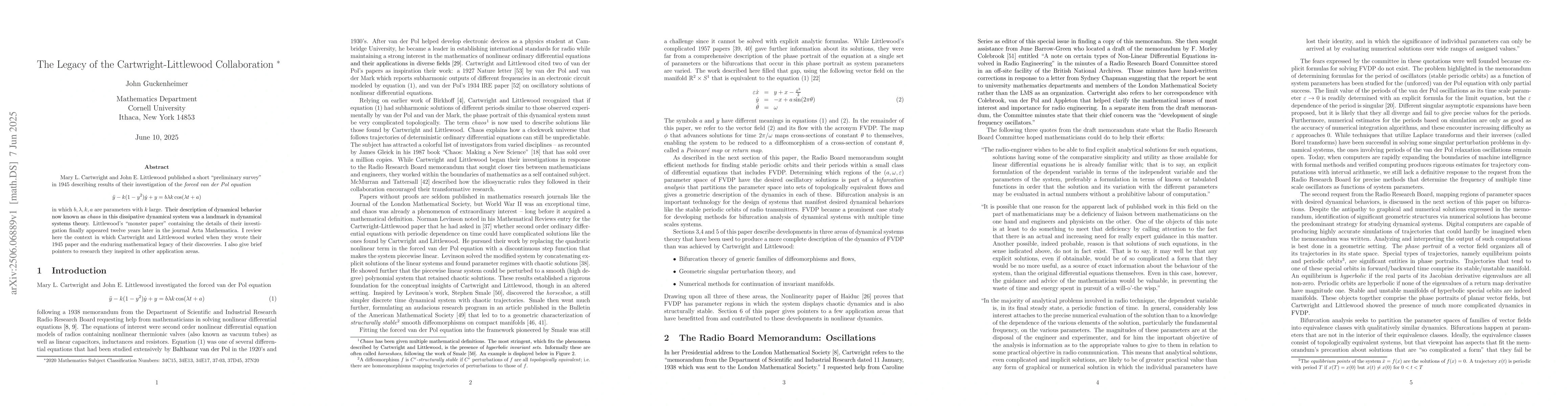 Mary L. Cartwright and John E. Littlewood published a short preliminary survey in 1945 describing results of their investigation of the forced van der Pol equation \begin{equation*} \ddot{y}-k(1-y^2)\dot{y}+y = b \lambda k \cos(\lambda t+a) \end{equation*} in which $b,\lambda,k,a$ are parameters with $k$ large. Their description of dynamical behavior now known as chaos in this dissipative dynamical system was a landmark in dynamical systems theory. Littlewood's monster paper containing the details of their investigation finally appeared twelve years later in the journal Acta Mathematica. I review here the context in which Cartwright and Littlewood worked when they wrote their 1945 paper and the enduring mathematical legacy of their discoveries. I also give brief pointers to research they inspired in other application areas.