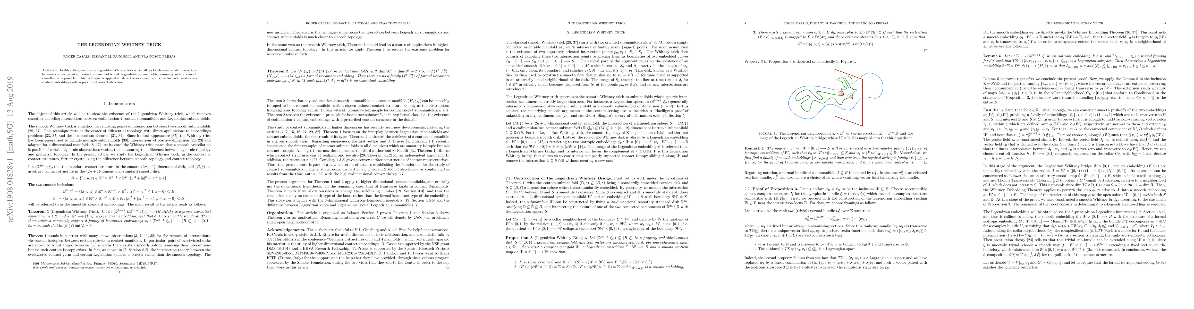 In this article, we prove a Legendrian Whitney trick which allows for the removal of intersections between codimension-two contact submanifolds and Legendrian submanifolds, assuming such a smooth cancellation is possible. This technique is applied to show the existence h-principle for codimension-two contact embeddings with a prescribed contact structure.