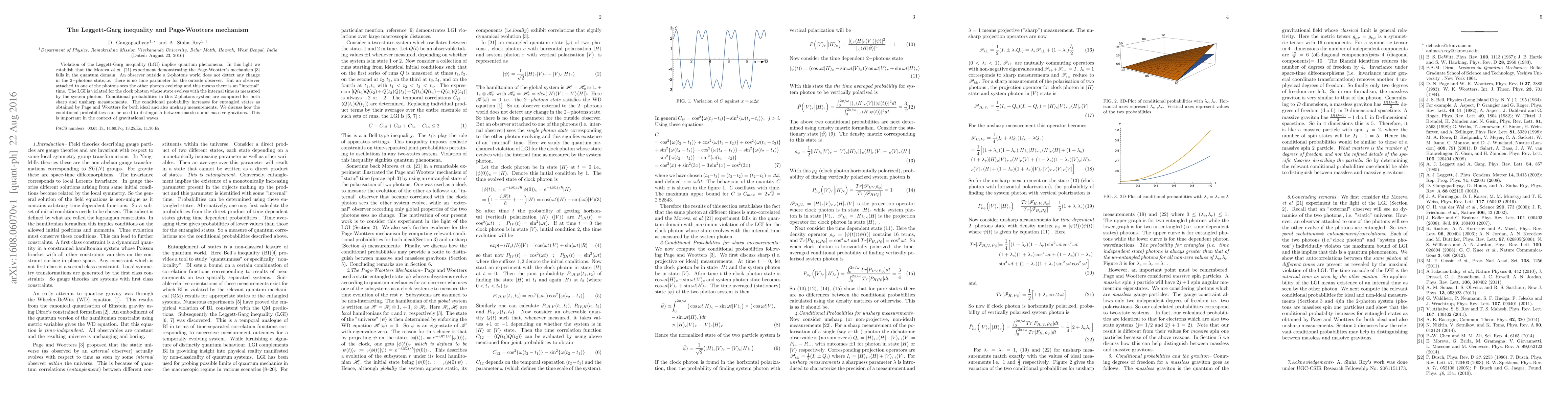 Violation of the Leggett-Garg inequality (LGI) implies quantum phenomena. In this light we establish that the Moreva \textit{et al.} \cite{moreva} experiment demonstrating the Page-Wootter's mechanism \cite{wootters} falls in the quantum domain. An observer outside a 2-photons world does not detect any change in the $2-$photons state,i.e. there is no time parameter for the outside observer. But an observer attached to one of the photons sees the other photon evolving and this means there is an "internal" time. The LGI is violated for the clock photon whose state evolves with the internal time as measured by the system photon. Conditional probabilities in this 2-photons system are computed for both sharp and unsharp measurements. The conditional probability increases for entangled states as obtained by Page and Wootters for both ideal and also unsharp measurements. We discuss how the conditional probabilities can be used to distinguish between massless and massive gravitons. This is important in the context of gravitational waves.