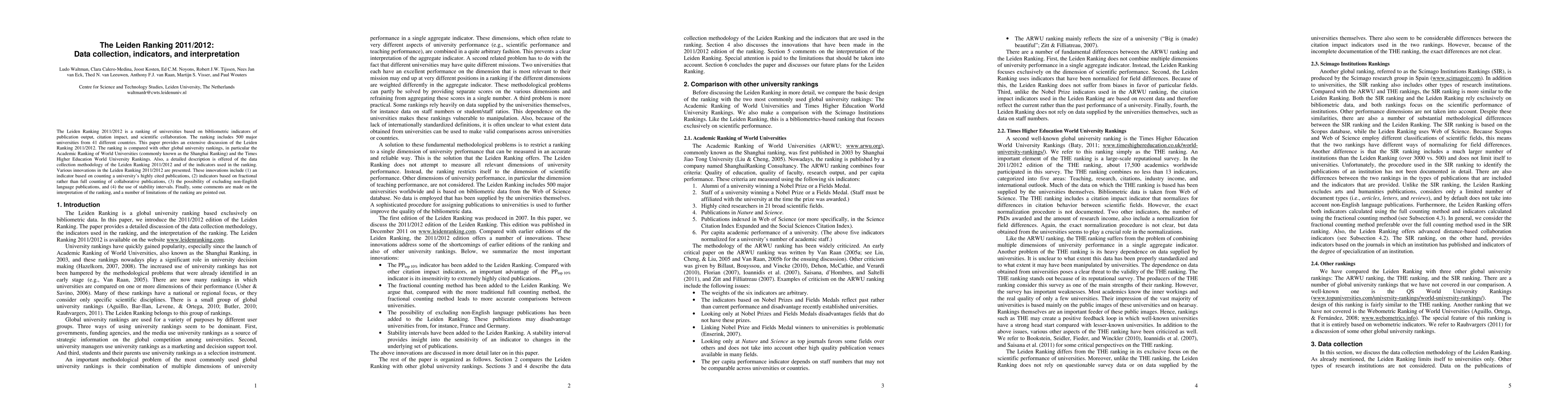 The Leiden Ranking 2011/2012 evaluates universities using bibliometric indicators for publication output, citation impact, and scientific collaboration, comparing it with other global rankings. It introduces innovative methods like counting highly cited publications and fractional counting of collaborative works.