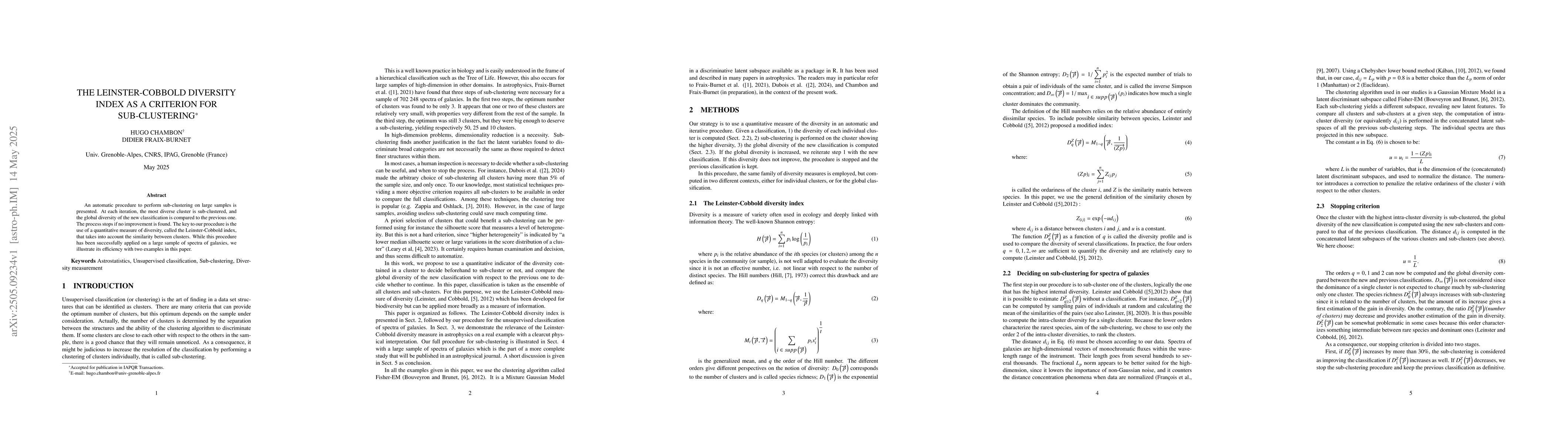 The research presents an automatic procedure for sub-clustering large samples, where the most diverse cluster is repeatedly sub-clustered. The global diversity of the new classification is compared to the previous one, stopping if no improvement is detected. This procedure utilizes the Leinster-Cobbold index, a quantitative measure of diversity that considers similarity between clusters.