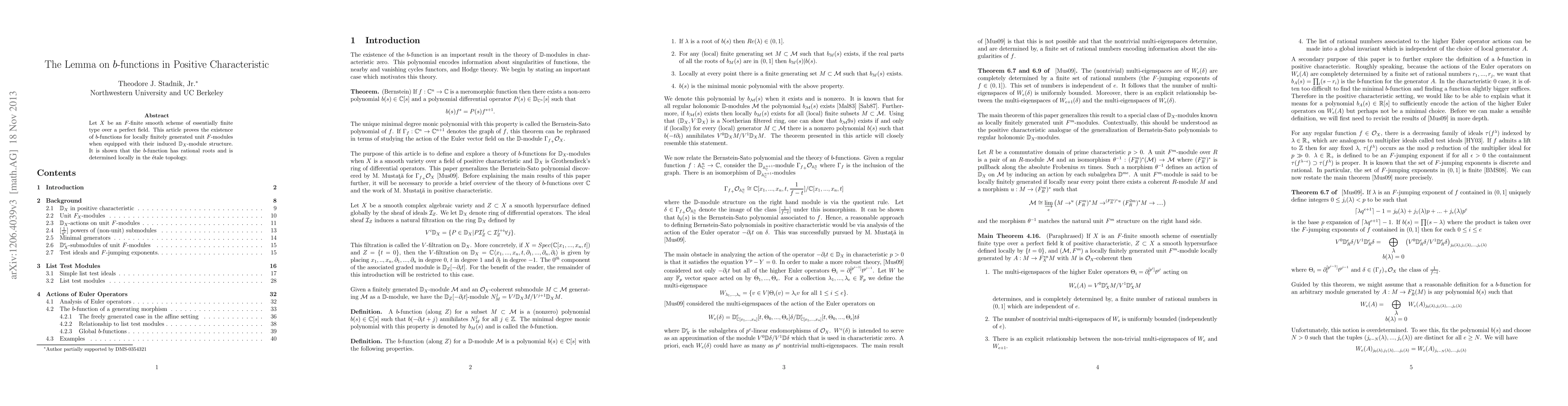 This research paper proves the existence of b-functions for locally finitely generated unit modules over a smooth scheme in positive characteristic, with applications to rational roots and local determination in etale topology.
