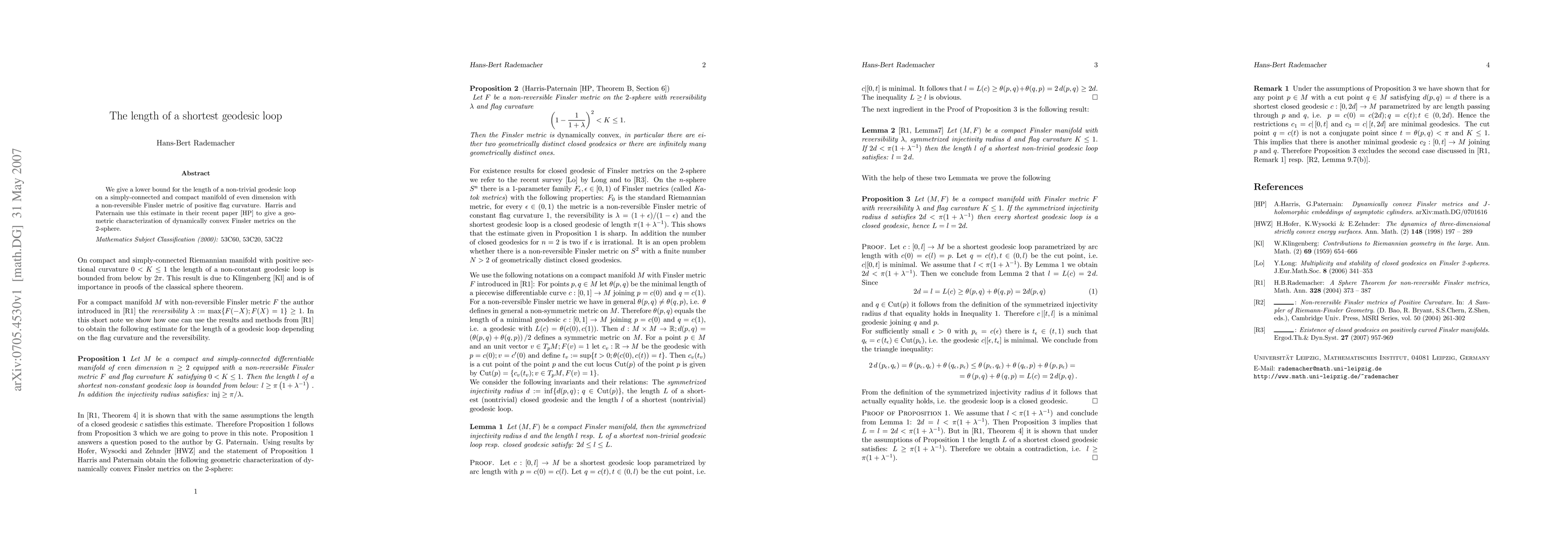 We give a lower bound for the length of a non-trivial geodesic loop on a simply-connected and compact manifold of even dimension with a non-reversible Finsler metric of positive flag curvature. Harris and Paternain use this estimate in their recent paper [HP] to give a geometric characterization of dynamically convex Finsler metrics on the 2-sphere.