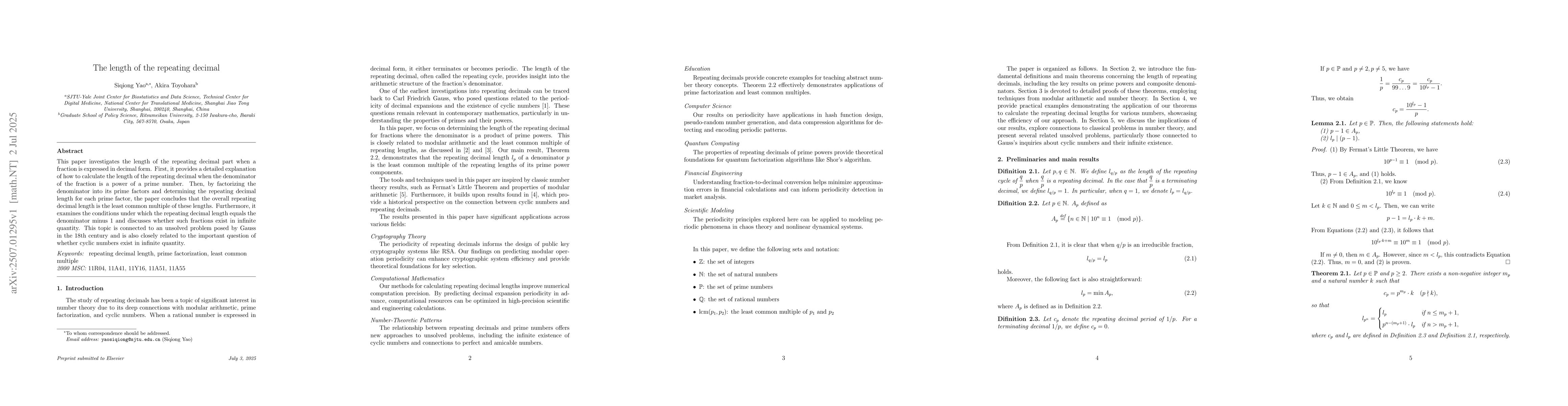 This paper explores the length of repeating decimals in fractions, finding it equals the least common multiple of lengths determined by prime factors of the denominator. It also links this topic to Gauss' unsolved problem on cyclic numbers and their potential infinity.