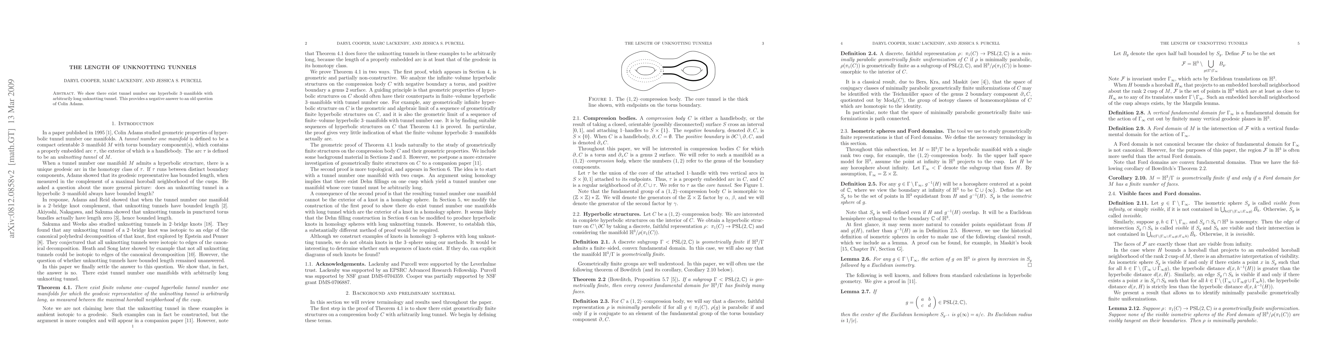 Summary: The paper demonstrates that hyperbolic 3-manifolds with tunnel number one can have unknotting tunnels of any length, providing a negative resolution to a longstanding question posed by Colin Adams. This challenges previous assumptions about the maximum length of unknotting tunnels.