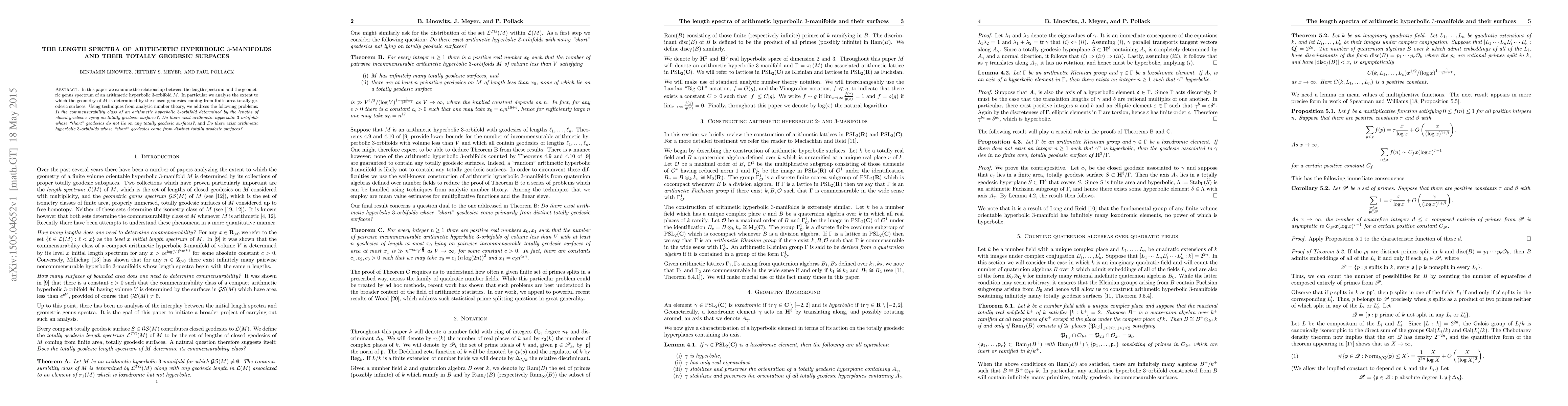 The work introduces new perspectives on the determination of arithmetic hyperbolic 3-orbifolds by their geodesic spectra, extending previous research in low-dimensional geometry and number theory.