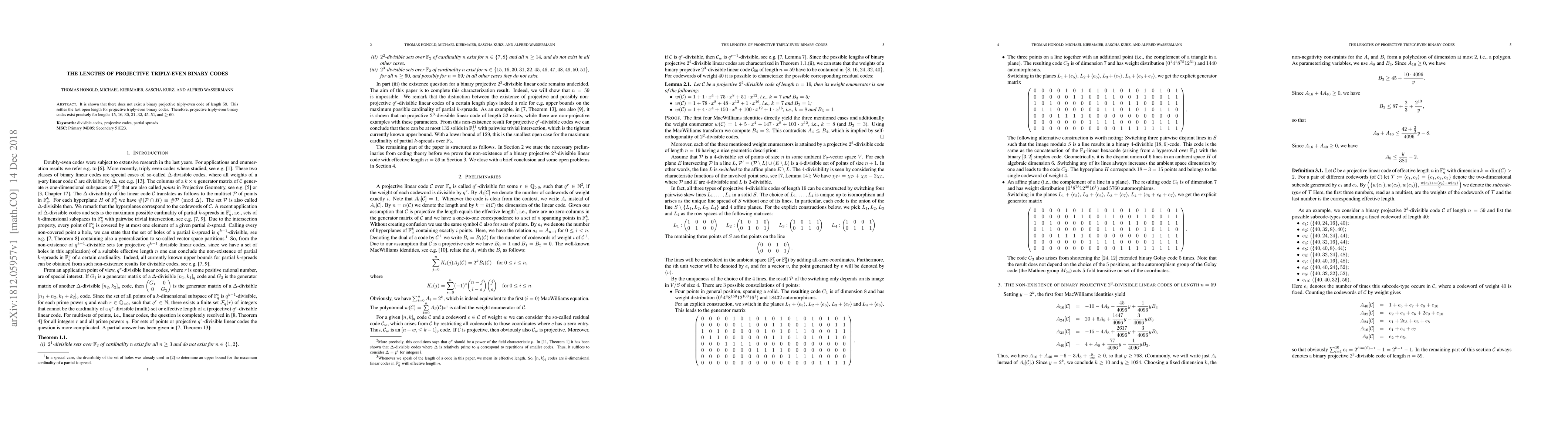 It is shown that there does not exist a binary projective triply-even code of length $59$. This settles the last open length for projective triply-even binary codes. Therefore, projective triply-even binary codes exist precisely for lengths $15$, $16$, $30$, $31$, $32$, $45$--$51$, and $\ge 60$.