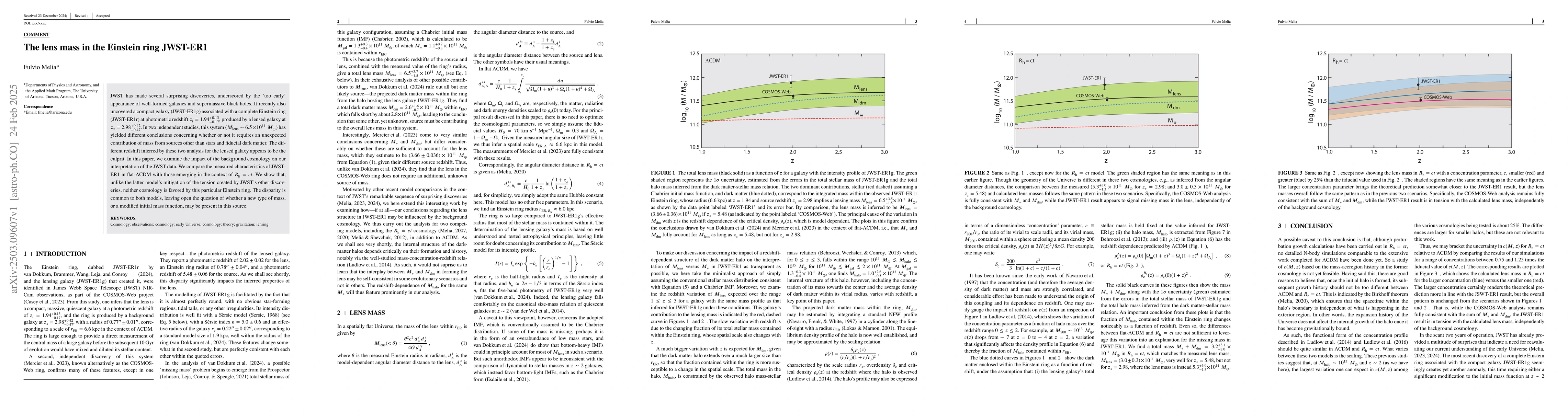 JWST has made several surprising discoveries, underscored by the `too early' appearance of well-formed galaxies and supermassive black holes. It recently also uncovered a compact galaxy (JWST-ER1g) associated with a complete Einstein ring (JWST-ER1r) at photometric redshift $z_l=1.94^{+0.13}_{-0.17}$, produced by a lensed galaxy at $z_s=2.98^{+0.42}_{-0.47}$. In two independent studies, this system ($M_{\rm lens}\sim 6.5\times 10^{11}\;M_\odot$) has yielded different conclusions concerning whether or not it requires an unexpected contribution of mass from sources other than stars and fiducial dark matter. The different redshift inferred by these two analysis for the lensed galaxy appears to be the culprit. In this paper, we examine the impact of the background cosmology on our interpretation of the JWST data. We compare the measured characteristics of JWST-ER1 in flat-$\Lambda$CDM with those emerging in the context of $R_{\rm h}=ct$. We show that, unlike the latter model's mitigation of the tension created by JWST's other discoveries, neither cosmology is favored by this particular Einstein ring. The disparity is common to both models, leaving open the question of whether a new type of mass, or a modified initial mass function, may be present in this source.