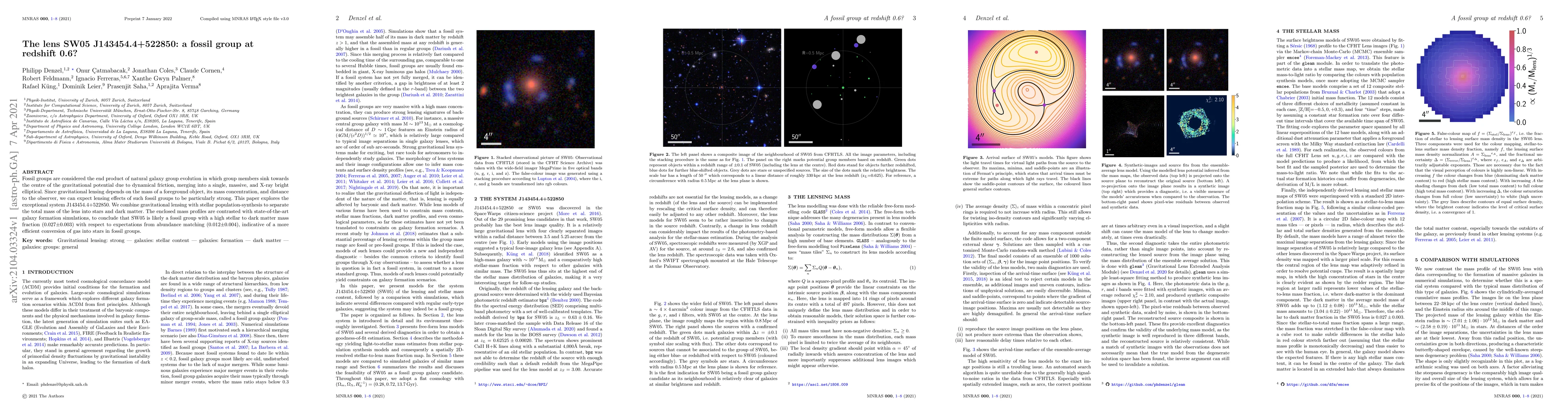 This paper investigates the lens SW05 J143454.4+522850, suggesting it is a fossil group at redshift 0.6, characterized by a high stellar to dark matter ratio, indicating efficient star formation relative to typical galaxy groups. The study combines gravitational lensing and stellar population-synthesis to analyze its mass distribution.