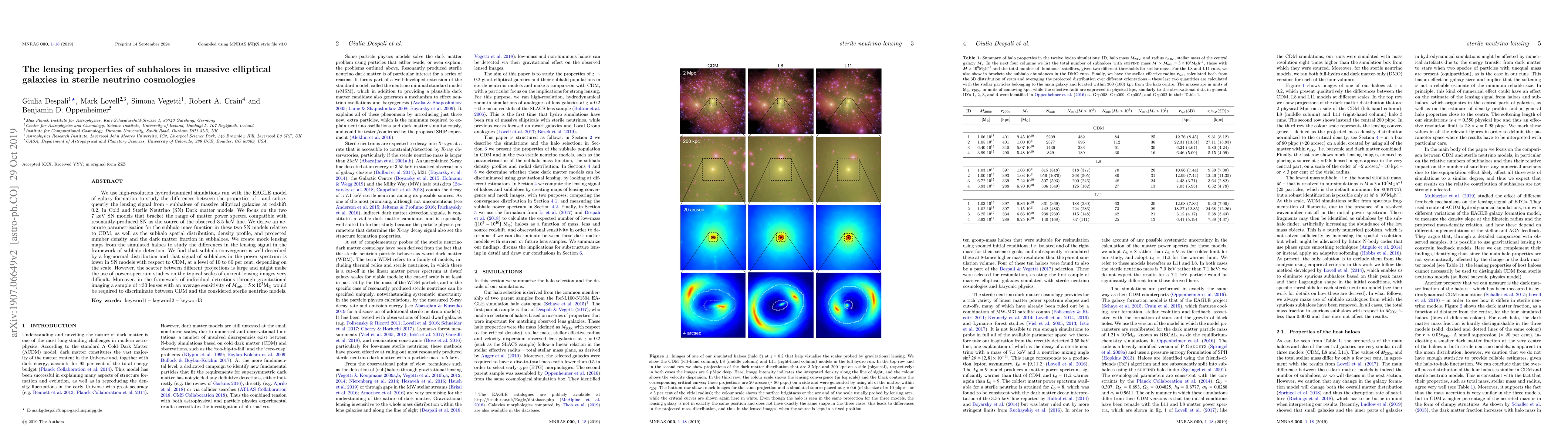 Research using hydrodynamical simulations found that subhaloes in massive elliptical galaxies produce a weaker lensing signal in sterile neutrino cosmologies than in CDM models, requiring larger sample sizes to detect differences.