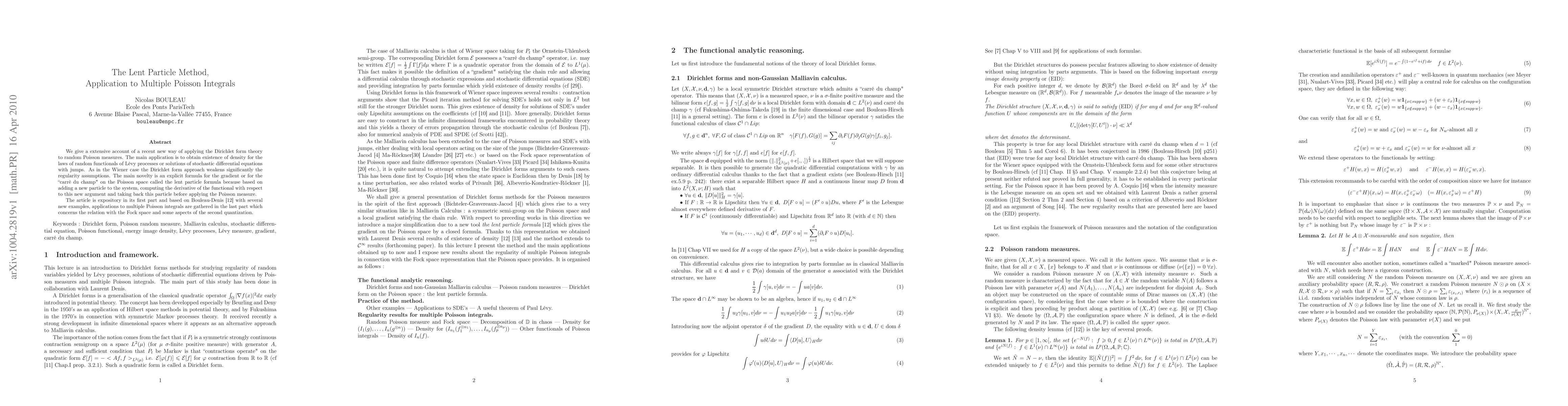 We give a extensive account of a recent new way of applying the Dirichlet form theory to random Poisson measures. The main application is to obtain existence of density for thelaws of random functionals of L\'evy processes or solutions of stochastic differential equations with jumps. As in the Wiener case the Dirichlet form approach weakens significantly theregularity assumptions. The main novelty is an explicit formula for the gradient or for the "carr\'e du champ' on the Poisson space called the lent particle formula because based on adding a new particle to the system, computing the derivative of the functional with respect to this new argument and taking back this particle before applying the Poisson measure. The article is expository in its first part and based on Bouleau-Denis [12] with several new examples, applications to multiple Poisson integrals are gathered in the last part which concerns the relation with the Fock space and some aspects of the second quantization.