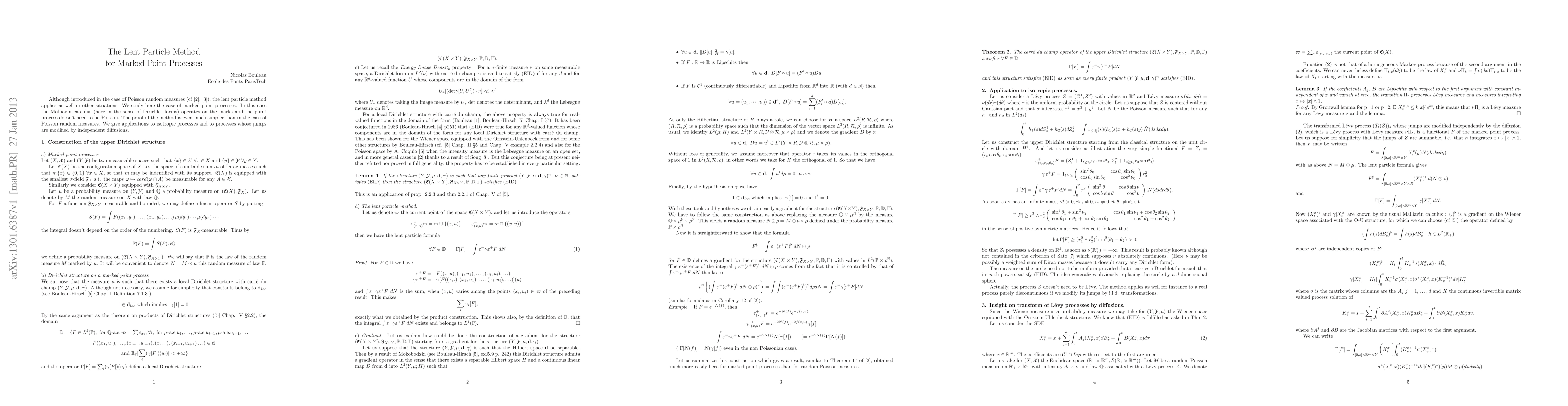 Although introduced in the case of Poisson random measures, the lent particle method applies as well in other situations. We study here the case of marked point processes. In this case the Malliavin calculus (here in the sense of Dirichlet forms) operates on the marks and the point process doesn't need to be Poisson. The proof of the method is even much simpler than in the case of Poisson random measures. We give applications to isotropic processes and to processes whose jumps are modified by independent diffusions.