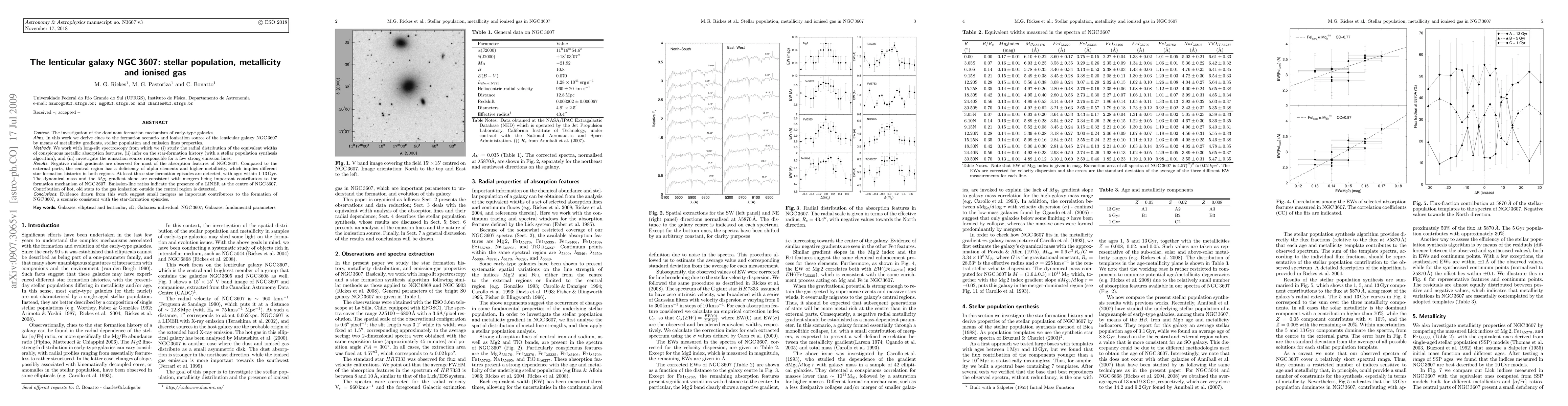 In this work we derive clues to the formation scenario and ionisation source of the lenticular galaxy NGC 3607 by means of metallicity gradients, stellar population and emission lines properties. We work with long-slit spectroscopy from which we (i) study the radial distribution of the equivalent widths of conspicuous metallic absorption features, (ii) infer on the star-formation history (with a stellar population synthesis algorithm), and (iii) investigate the ionisation source responsible for a few strong emission lines. Negative radial gradients are observed for most of the absorption features of NGC 3607. Compared to the external parts, the central region has a deficiency of alpha elements and higher metallicity, which implies different star-formation histories in both regions. At least three star formation episodes are detected, with ages within 1-13 Gyr. The dynamical mass and the $Mg_2$ gradient slope are consistent with mergers being important contributors to the formation mechanism of NGC 3607. Emission-line ratios indicate the presence of a LINER at the centre of NGC 3607. Contribution of hot, old stars to the gas ionisation outside the central region is detected. Evidence drawn from this work suggest small mergers as important contributors to the formation of NGC 3607, a scenario consistent with the star-formation episodes.