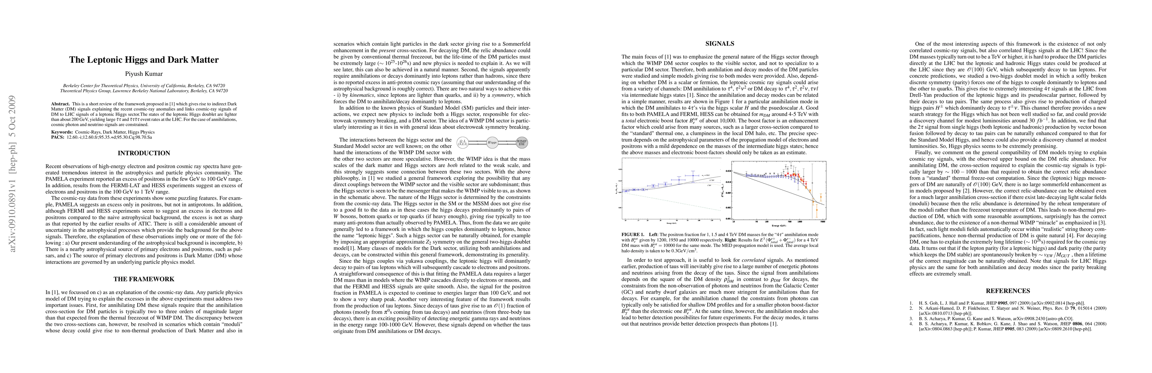 This is a short review of the framework proposed in \cite{Goh:2009wg} which gives rise to indirect Dark Matter (DM) signals explaining the recent cosmic-ray anomalies and links cosmic-ray signals of DM to LHC signals of a leptonic Higgs sector.The states of the leptonic Higgs doublet are lighter than about 200 GeV, yielding large 2 tau and 4 tau event rates at the LHC. For the case of annihilations, cosmic photon and neutrino signals are constrained.