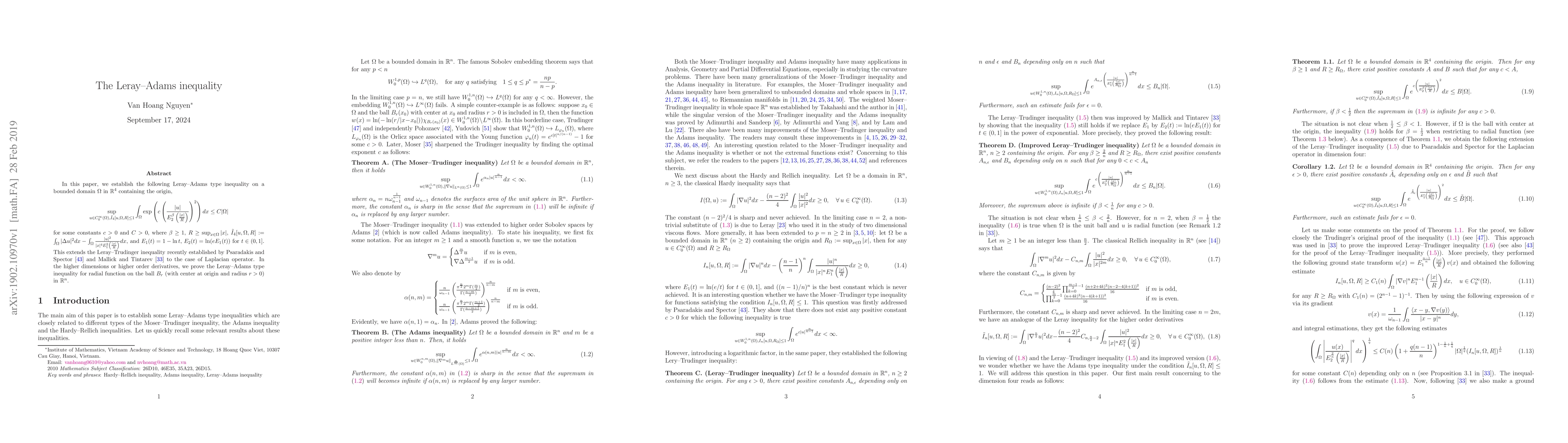 This paper establishes a Leray-Adams type inequality for a bounded domain in $\mathbb R^{4}$, extending the Leray-Trudinger inequality to the Laplacian operator. The inequality involves a supremum over smooth functions and includes a novel integral involving exponential terms.