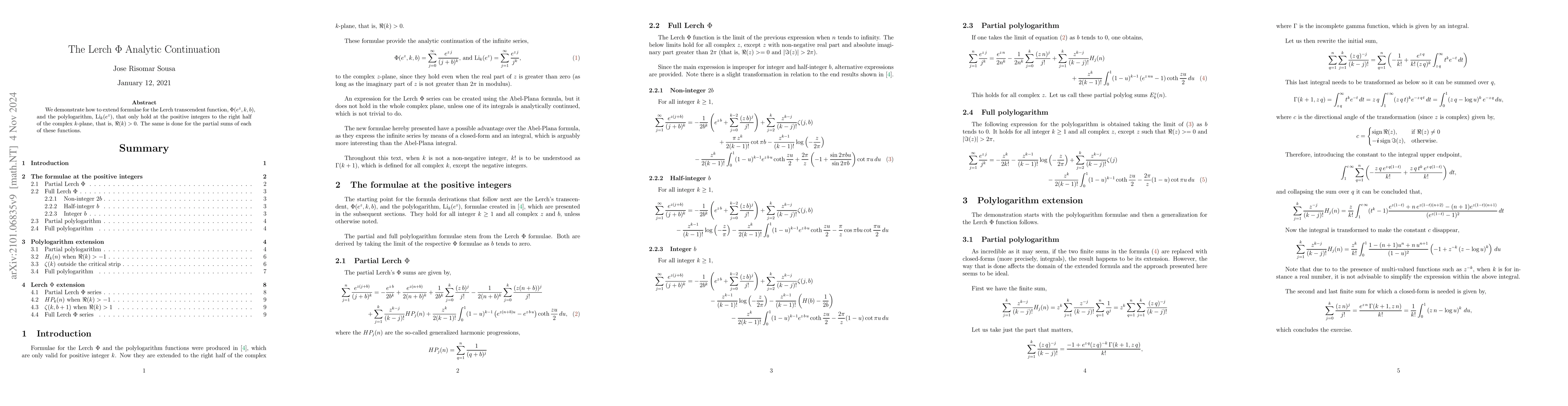 We demonstrate how to obtain the analytic continuation of formulae for the Lerch transcendent function, $\Phi(e^m,k,b)$, and the polylogarithm, $\mathrm{Li}_{k}(e^{m})$, that only hold at the positive integers. The result are alternative expressions for these functions and their partial sums valid in the complex half-plane, $\Re{(k)}>0$.