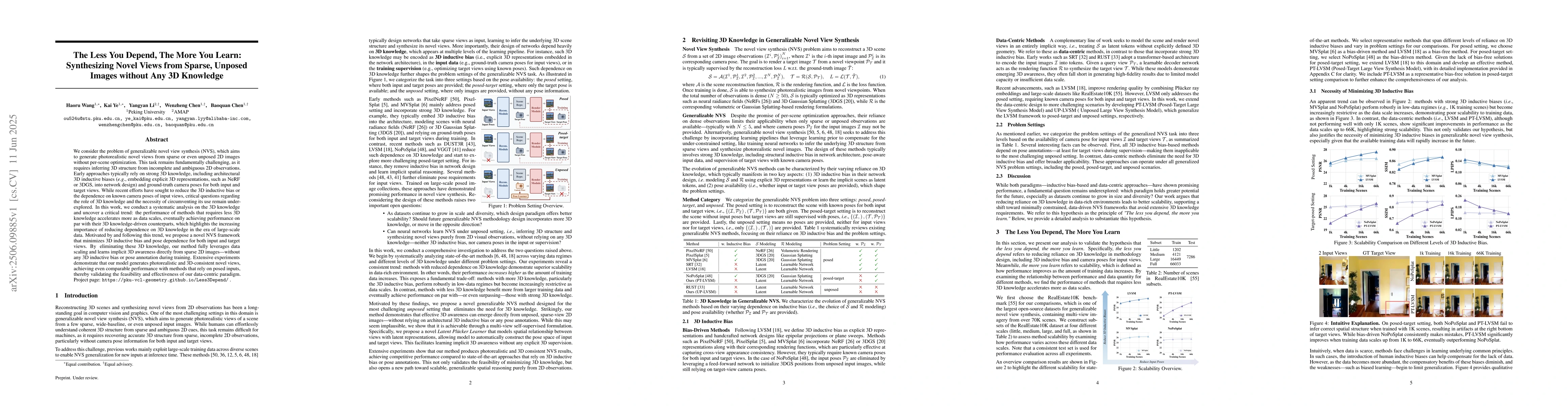 We consider the problem of generalizable novel view synthesis (NVS), which aims to generate photorealistic novel views from sparse or even unposed 2D images without per-scene optimization. This task remains fundamentally challenging, as it requires inferring 3D structure from incomplete and ambiguous 2D observations. Early approaches typically rely on strong 3D knowledge, including architectural 3D inductive biases (e.g., embedding explicit 3D representations, such as NeRF or 3DGS, into network design) and ground-truth camera poses for both input and target views. While recent efforts have sought to reduce the 3D inductive bias or the dependence on known camera poses of input views, critical questions regarding the role of 3D knowledge and the necessity of circumventing its use remain under-explored. In this work, we conduct a systematic analysis on the 3D knowledge and uncover a critical trend: the performance of methods that requires less 3D knowledge accelerates more as data scales, eventually achieving performance on par with their 3D knowledge-driven counterparts, which highlights the increasing importance of reducing dependence on 3D knowledge in the era of large-scale data. Motivated by and following this trend, we propose a novel NVS framework that minimizes 3D inductive bias and pose dependence for both input and target views. By eliminating this 3D knowledge, our method fully leverages data scaling and learns implicit 3D awareness directly from sparse 2D images, without any 3D inductive bias or pose annotation during training. Extensive experiments demonstrate that our model generates photorealistic and 3D-consistent novel views, achieving even comparable performance with methods that rely on posed inputs, thereby validating the feasibility and effectiveness of our data-centric paradigm. Project page: https://pku-vcl-geometry.github.io/Less3Depend/ .
