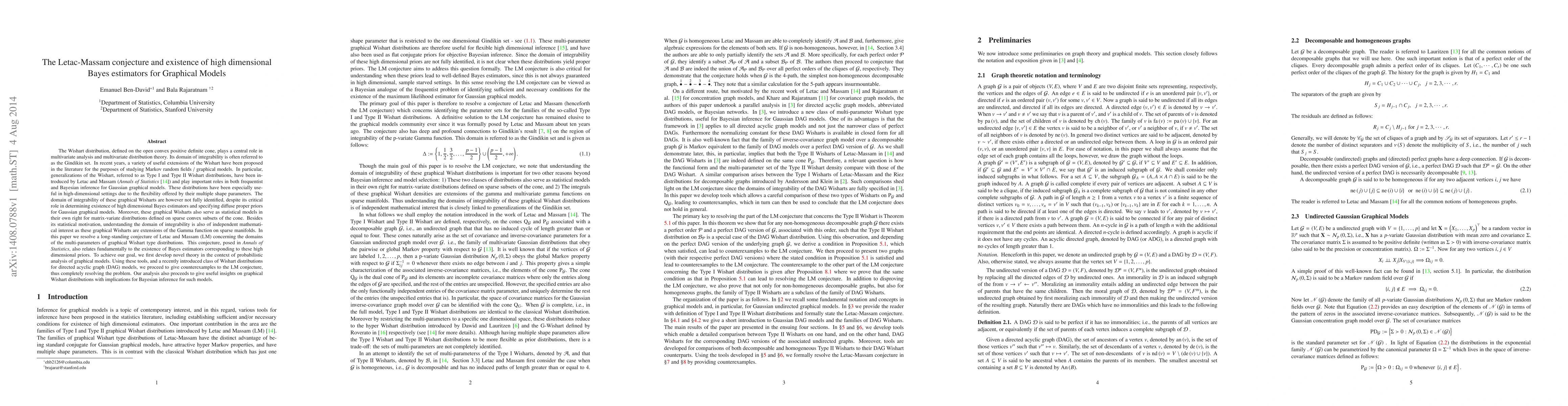 This paper resolves the Letac-Massam conjecture regarding the domains of multi-parameters in graphical Wishart type distributions, which also pertains to the existence of high-dimensional Bayes estimators for Gaussian graphical models. The authors develop new probabilistic analysis tools and provide counterexamples to disprove the conjecture, offering valuable insights for Bayesian inference in high-dimensional settings.
