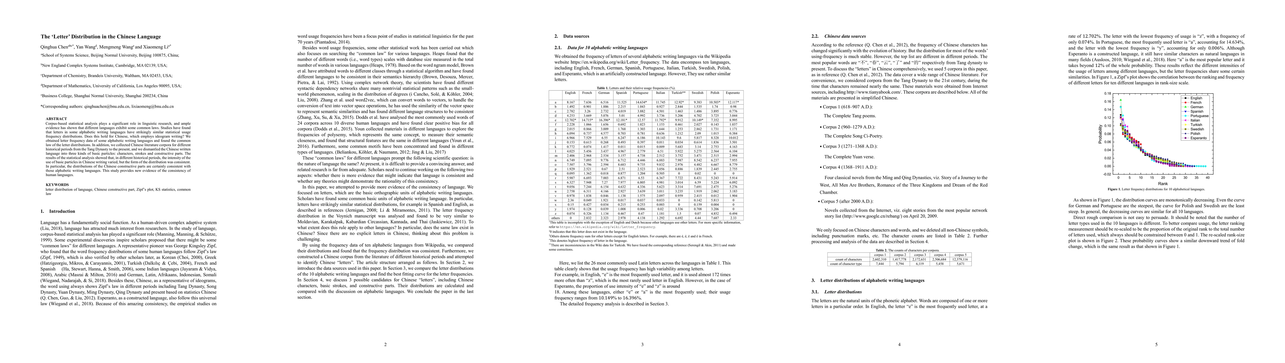 Corpus-based statistical analysis plays a significant role in linguistic research, and ample evidence has shown that different languages exhibit some common laws. Studies have found that letters in some alphabetic writing languages have strikingly similar statistical usage frequency distributions. Does this hold for Chinese, which employs ideogram writing? We obtained letter frequency data of some alphabetic writing languages and found the common law of the letter distributions. In addition, we collected Chinese literature corpora for different historical periods from the Tang Dynasty to the present, and we dismantled the Chinese written language into three kinds of basic particles: characters, strokes and constructive parts. The results of the statistical analysis showed that, in different historical periods, the intensity of the use of basic particles in Chinese writing varied, but the form of the distribution was consistent. In particular, the distributions of the Chinese constructive parts are certainly consistent with those alphabetic writing languages. This study provides new evidence of the consistency of human languages.