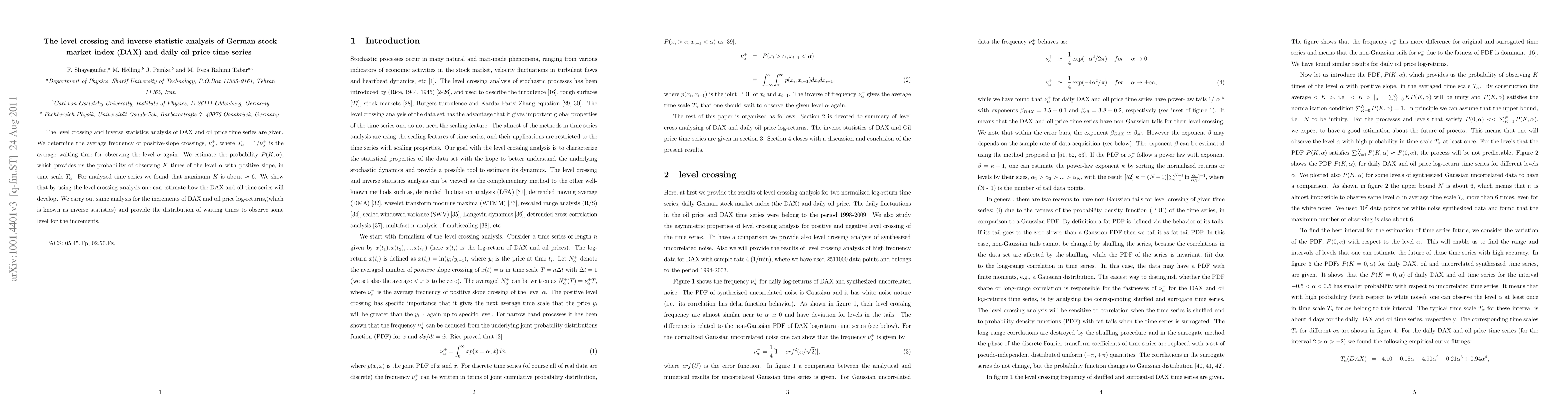 The level crossing and inverse statistics analysis of DAX and oil price time series are given. We determine the average frequency of positive-slope crossings, $\nu_{\alpha}^+$, where $T_{\alpha} =1/\nu_{\alpha}^+ $ is the average waiting time for observing the level $\alpha$ again. We estimate the probability $P(K, \alpha)$, which provides us the probability of observing $K$ times of the level $\alpha$ with positive slope, in time scale $T_{\alpha}$. For analyzed time series we found that maximum $K$ is about 6. We show that by using the level crossing analysis one can estimate how the DAX and oil time series will develop. We carry out same analysis for the increments of DAX and oil price log-returns,(which is known as inverse statistics) and provide the distribution of waiting times to observe some level for the increments.