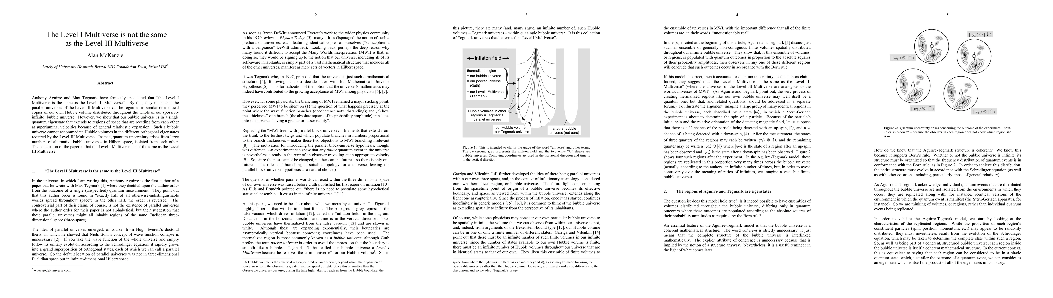 Anthony Aguirre and Max Tegmark have famously speculated that the Level I Multiverse is the same as the Level III Multiverse. By this, they mean that the parallel universes of the Level III Multiverse can be regarded as similar or identical copies of our own Hubble volume distributed throughout the whole of our (possibly infinite) bubble universe. However, we show that our bubble universe is in a single quantum eigenstate that extends to regions of space that are receding from each other at superluminal velocities because of general relativistic expansion. Such a bubble universe cannot accommodate Hubble volumes in the different orthogonal eigenstates required by the Level III Multiverse. Instead, quantum uncertainty arises from large numbers of alternative bubble universes in Hilbert space, isolated from each other. The conclusion of the paper is that the Level I Multiverse is not the same as the Level III Multiverse.