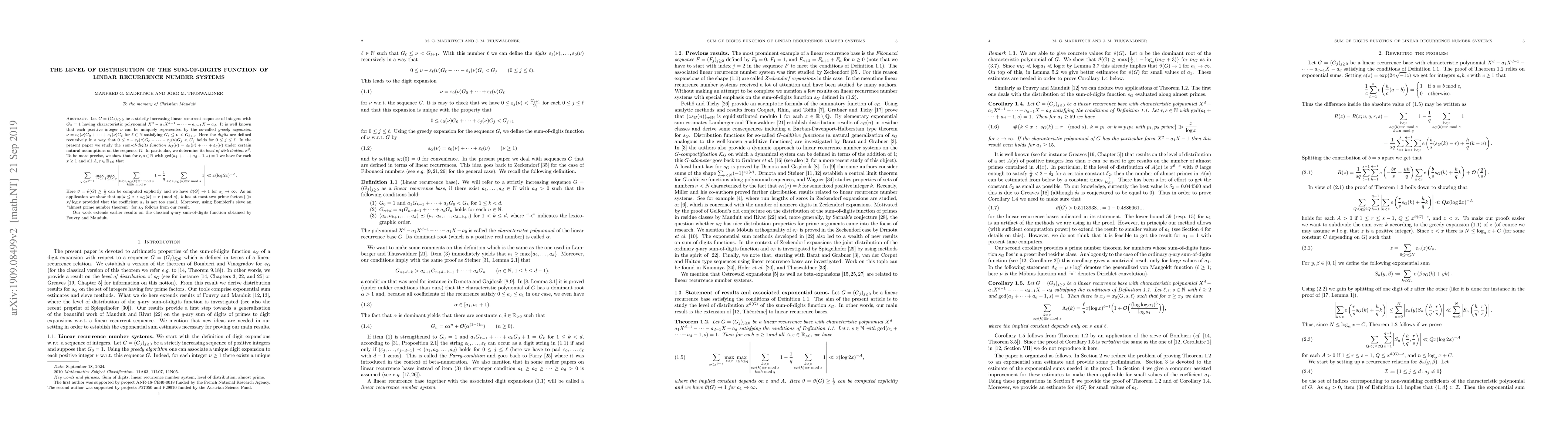 A research paper studies the distribution of the sum-of-digits function in linear recurrence number systems, finding that its level of distribution is related to the characteristic polynomial's parameters, with implications for counting elements with certain properties.
