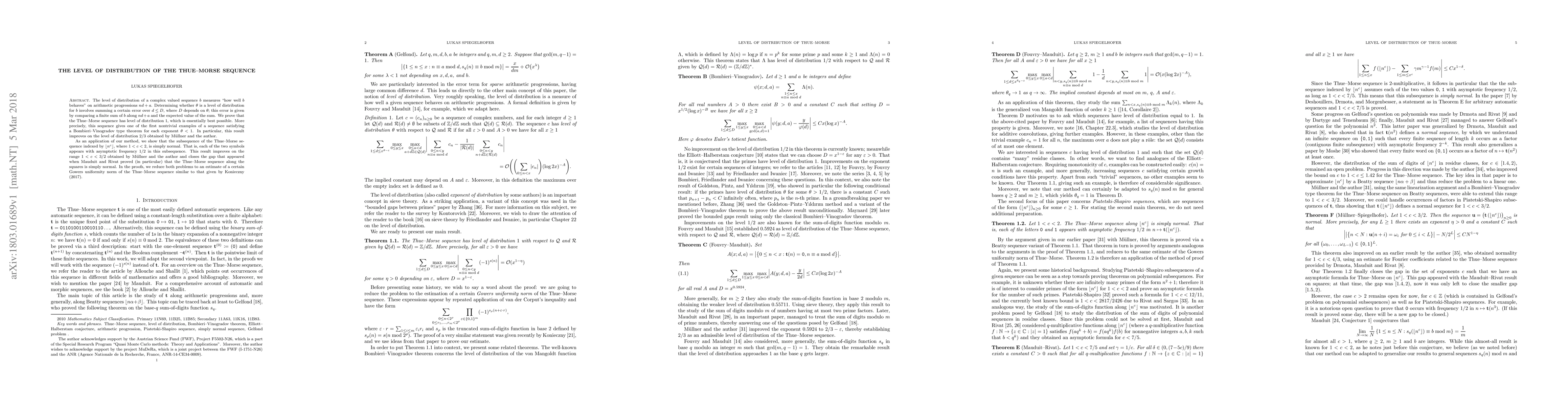 The paper proves that the Thue-Morse sequence has the best possible level of distribution of 1, enhancing previous results. It also shows that a subsequence of the Thue-Morse sequence is simply normal, improving previous bounds and closing a previously existing gap.
