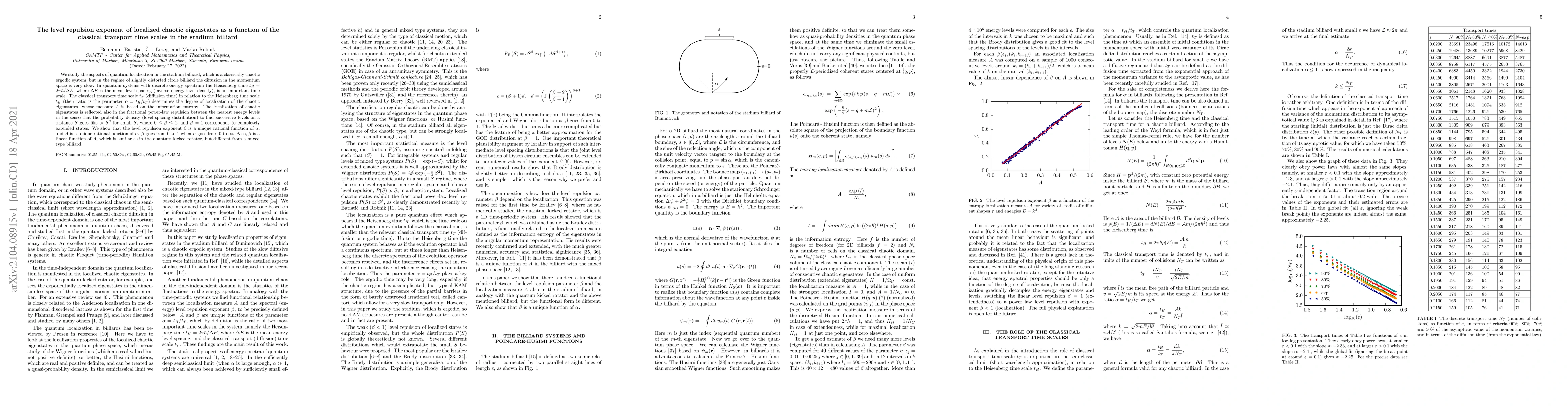 This paper investigates quantum localization in the stadium billiard, a chaotic ergodic system, and finds that the level repulsion exponent $\beta$ and the localization measure $A$ are unique rational functions of the ratio $\alpha$ between the Heisenberg time $t_H$ and the classical transport time $t_T$. The study reveals that $\beta$ varies from $0$ to $1$ as $\alpha$ increases from $0$ to $\infty$, indicating the degree of localization of chaotic eigenstates.