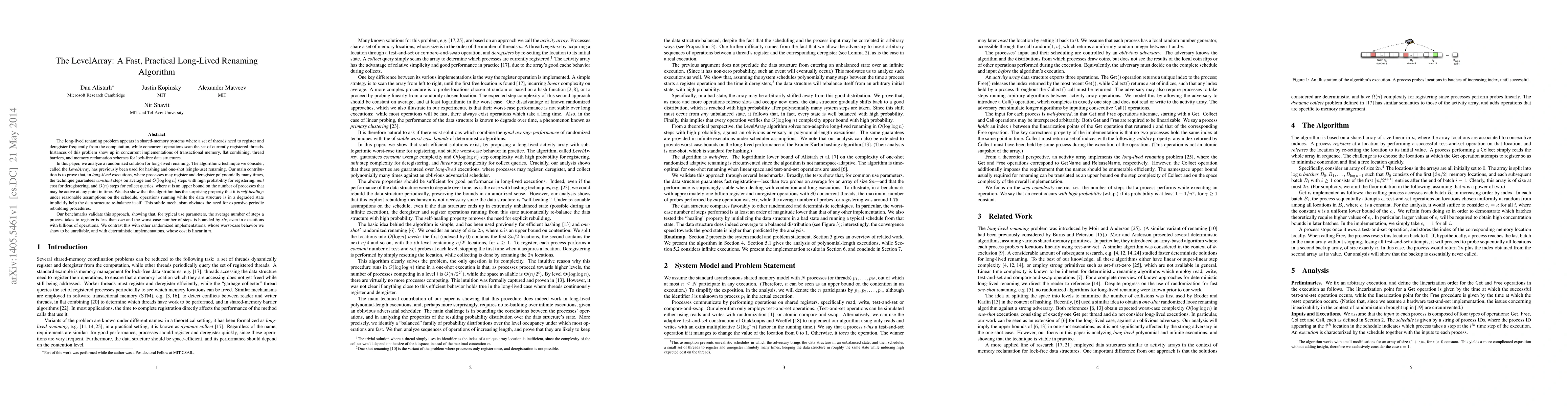 The LevelArray algorithm provides fast and practical long-lived renaming for shared-memory systems, with average registration steps less than two and worst-case steps bounded by six, making it a reliable alternative to other implementations.