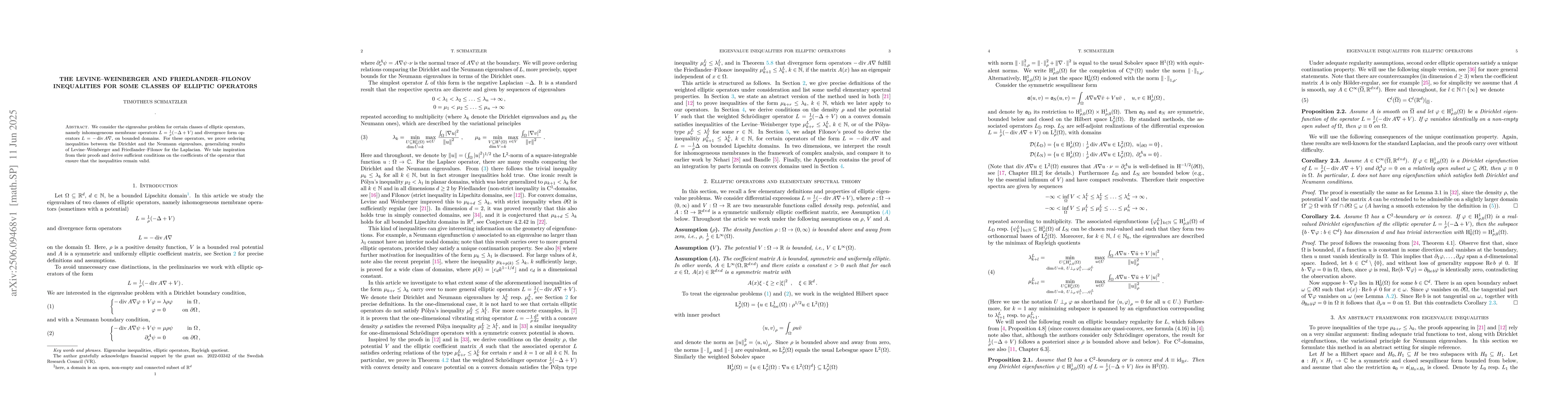 We consider the eigenvalue problem for certain classes of elliptic operators, namely inhomogeneous membrane operators $ L = \tfrac{1}{ \rho } ( -\Delta + V ) $ and divergence form operators $ L = -\operatorname{div} A \nabla $, on bounded domains. For these operators, we prove ordering inequalities between the Dirichlet and the Neumann eigenvalues, generalizing results of Levine--Weinberger and Friedlander--Filonov for the Laplacian. We take inspiration from their proofs and derive sufficient conditions on the coefficients of the operator that ensure that the inequalities remain valid.