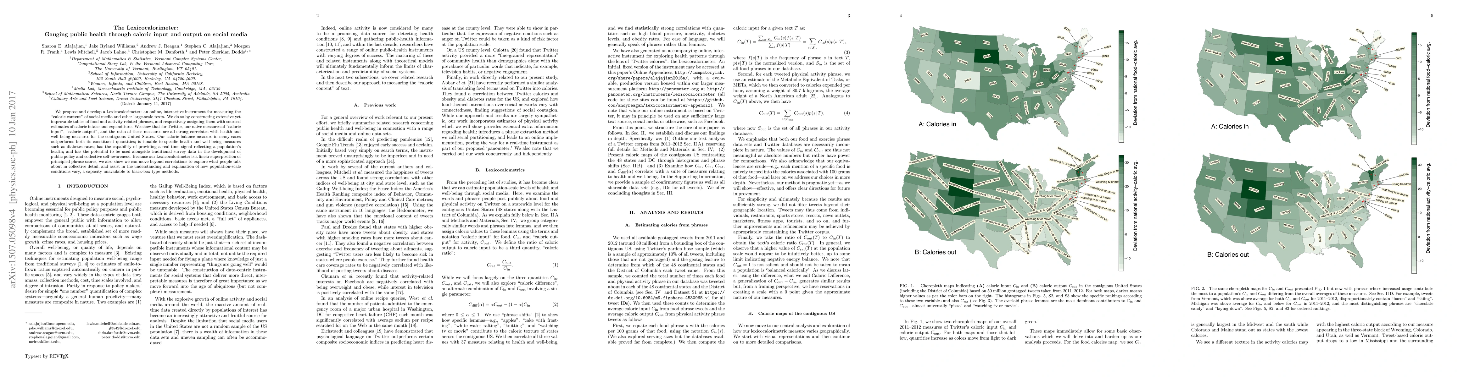 We propose and develop a Lexicocalorimeter: an online, interactive instrument for measuring the "caloric content" of social media and other large-scale texts. We do so by constructing extensive yet improvable tables of food and activity related phrases, and respectively assigning them with sourced estimates of caloric intake and expenditure. We show that for Twitter, our naive measures of "caloric input", "caloric output", and the ratio of these measures are all strong correlates with health and well-being measures for the contiguous United States. Our caloric balance measure in many cases outperforms both its constituent quantities, is tunable to specific health and well-being measures such as diabetes rates, has the capability of providing a real-time signal reflecting a population's health, and has the potential to be used alongside traditional survey data in the development of public policy and collective self-awareness. Because our Lexicocalorimeter is a linear superposition of principled phrase scores, we also show we can move beyond correlations to explore what people talk about in collective detail, and assist in the understanding and explanation of how population-scale conditions vary, a capacity unavailable to black-box type methods.