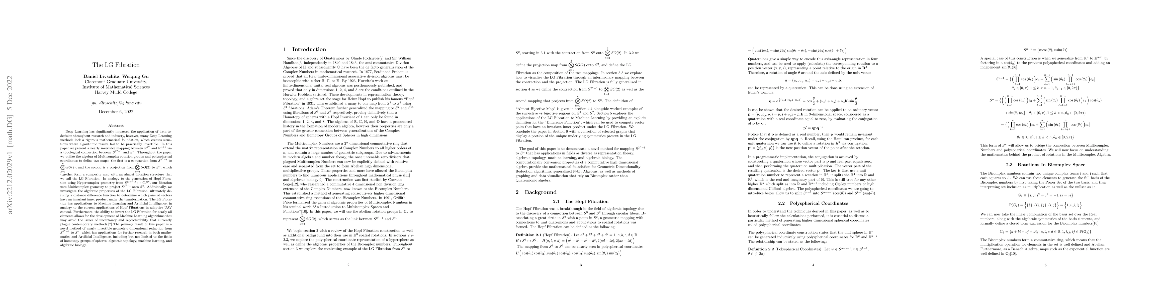 Deep Learning has significantly impacted the application of data-to-decision throughout research and industry, however, they lack a rigorous mathematical foundation, which creates situations where algorithmic results fail to be practically invertible. In this paper we present a nearly invertible mapping between $\mathbb{R}^{2^n}$ and $\mathbb{R}^{n+1}$ via a topological connection between $S^{2^n-1}$ and $S^n$. Throughout the paper we utilize the algebra of Multicomplex rotation groups and polyspherical coordinates to define two maps: the first is a contraction from $S^{2^n-1}$ to $\displaystyle \otimes^n_{k=1} SO(2)$, and the second is a projection from $\displaystyle \otimes^n_{k=1} SO(2)$ to $S^{n}$. Together these form a composite map that we call the LG Fibration. In analogy to the generation of Hopf Fibration using Hypercomplex geometry from $S^{(2n-1)} \mapsto CP^n$, our fibration uses Multicomplex geometry to project $S^{2^n-1}$ onto $S^n$. We also investigate the algebraic properties of the LG Fibration, ultimately deriving a distance difference function to determine which pairs of vectors have an invariant inner product under the transformation. The LG Fibration has applications to Machine Learning and AI, in analogy to the current applications of Hopf Fibrations in adaptive UAV control. Furthermore, the ability to invert the LG Fibration for nearly all elements allows for the development of Machine Learning algorithms that may avoid the issues of uncertainty and reproducibility that currently plague contemporary methods. The primary result of this paper is a novel method of nearly invertible geometric dimensional reduction from $S^{2^n-1}$ to $S^n$, which has the capability to extend the research in both mathematics and AI, including but not limited to the fields of homotopy groups of spheres, algebraic topology, machine learning, and algebraic biology.