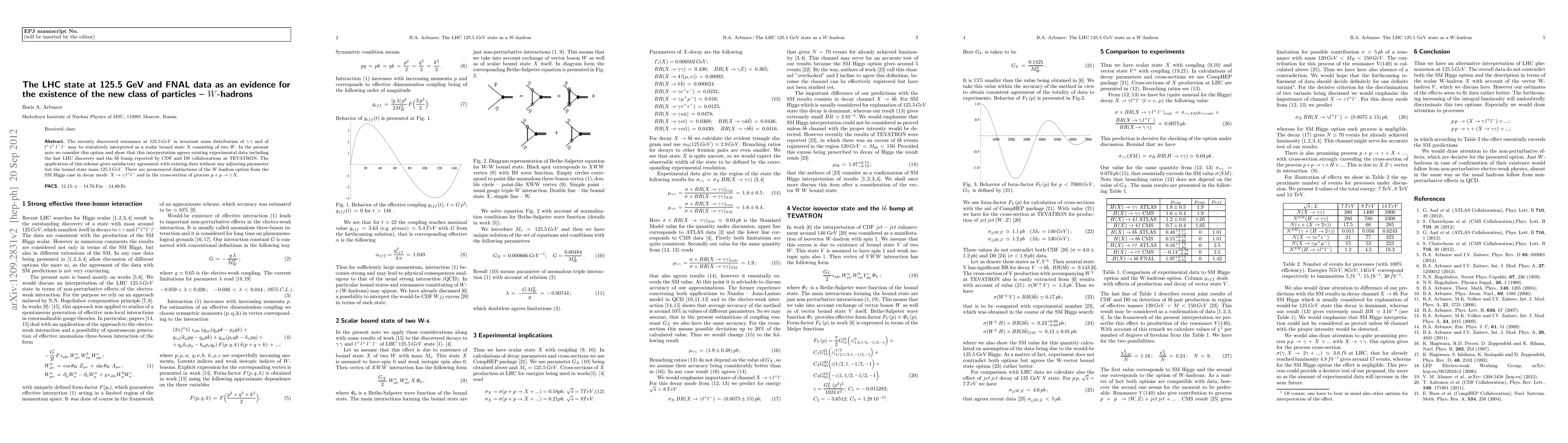 The recently discovered resonance at $125.5\, GeV$ in invariant mass distribution of $\gamma\, \gamma$ and of $l^+\,l^+\,l^-\,l^-$ may be tentatively interpreted as a scalar bound state $X$ consisting of two $W$. In the present note we consider this option and show that this interpretation agrees existing experimental data including the last LHC discovery and the $b \bar b$ bump reported by CDF and D0 collaborations at TEVATRON. The application of this scheme gives satisfactory agreement with existing data without any adjusting parameter but the bound state mass $125.5\,GeV$. There are pronounced distinctions of the $W$-hadron option from the SM Higgs case in decay mode $\,X \to \gamma\, l^+ l^-$ and in the cross-section of process $p + p \to \gamma\, X$.