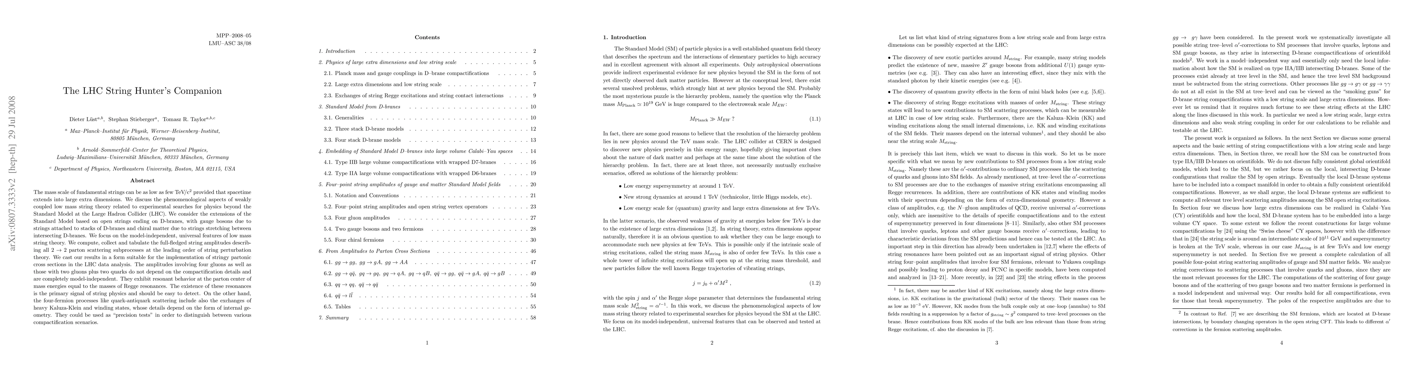 The mass scale of fundamental strings can be as low as few TeV/c^2 provided that spacetime extends into large extra dimensions. We discuss the phenomenological aspects of weakly coupled low mass string theory related to experimental searches for physics beyond the Standard Model at the Large Hadron Collider (LHC). We consider the extensions of the Standard Model based on open strings ending on D-branes, with gauge bosons due to strings attached to stacks of D-branes and chiral matter due to strings stretching between intersecting D-branes. We focus on the model-independent, universal features of low mass string theory. We compute, collect and tabulate the full-fledged string amplitudes describing all 2->2 parton scattering subprocesses at the leading order of string perturbation theory. We cast our results in a form suitable for the implementation of stringy partonic cross sections in the LHC data analysis. The amplitudes involving four gluons as well as those with two gluons plus two quarks do not depend on the compactification details and are completely model-independent. They exhibit resonant behavior at the parton center of mass energies equal to the masses of Regge resonances. The existence of these resonances is the primary signal of string physics and should be easy to detect. On the other hand, the four-fermion processes like quark-antiquark scattering include also the exchanges of heavy Kaluza-Klein and winding states, whose details depend on the form of internal geometry. They could be used as ``precision tests'' in order to distinguish between various compactification scenarios.