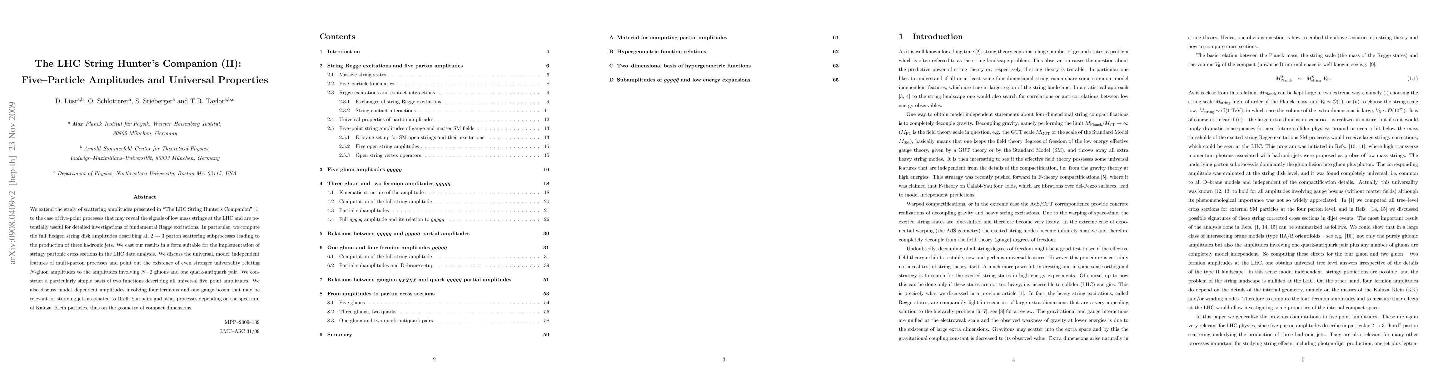 We extend the study of scattering amplitudes presented in ``The LHC String Hunter's Companion'' to the case of five-point processes that may reveal the signals of low mass strings at the LHC and are potentially useful for detailed investigations of fundamental Regge excitations. In particular, we compute the full-fledged string disk amplitudes describing all 2->3 parton scattering subprocesses leading to the production of three hadronic jets. We cast our results in a form suitable for the implementation of stringy partonic cross sections in the LHC data analysis. We discuss the universal, model-independent features of multi-parton processes and point out the existence of even stronger universality relating N-gluon amplitudes to the amplitudes involving N-2 gluons and one quark-antiquark pair. We construct a particularly simple basis of two functions describing all universal five-point amplitudes. We also discuss model-dependent amplitudes involving four fermions and one gauge boson that may be relevant for studying jets associated to Drell-Yan pairs and other processes depending on the spectrum of Kaluza-Klein particles, thus on the geometry of compact dimensions.