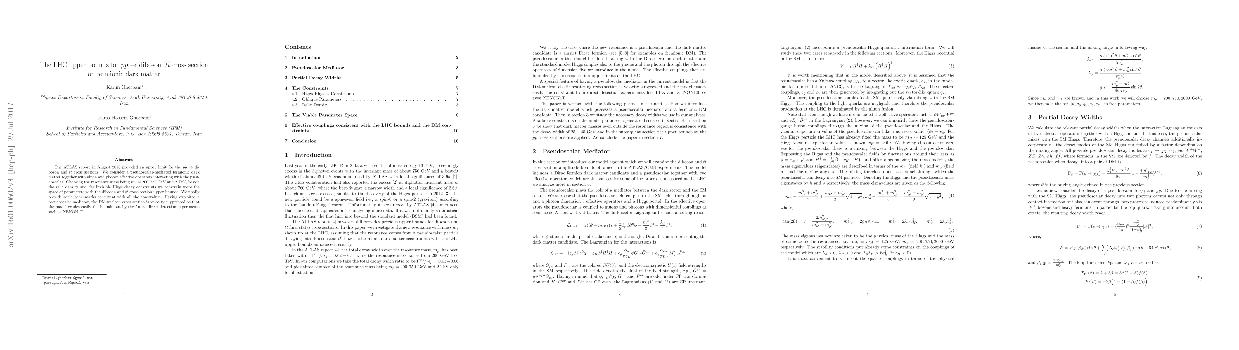 This paper examines the upper bounds on the $pp \to$ diboson and $t\bar t$ cross sections from the ATLAS experiment to constrain the parameter space for fermionic dark matter mediated by a pseudoscalar. The study provides benchmarks consistent with the diboson and $t\bar t$ constraints, alongside relic density and invisible Higgs decay limits, while noting that the model evades future direct detection experiment bounds due to velocity suppression.