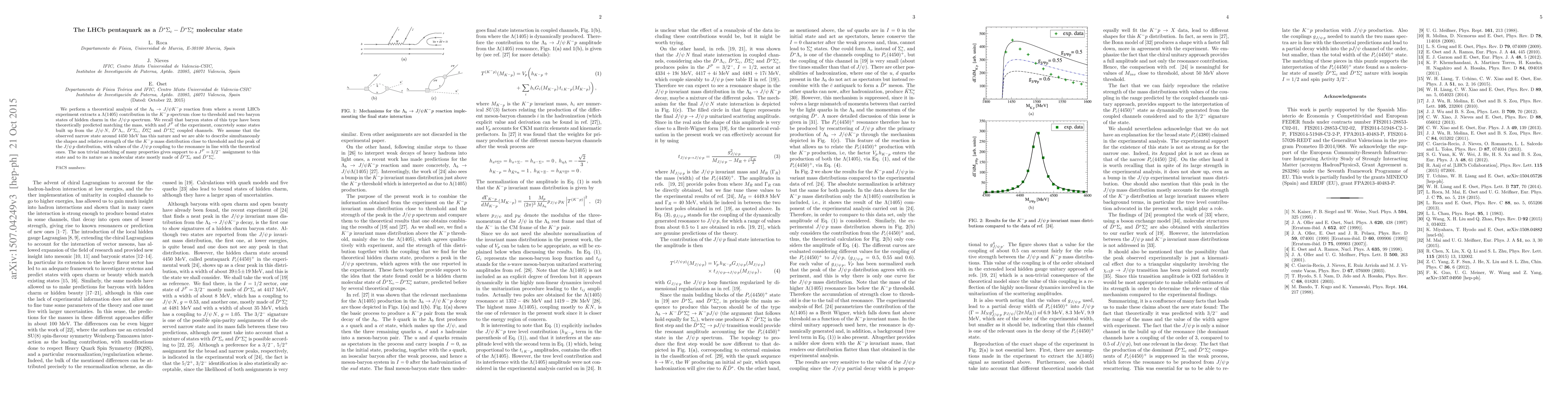 We perform a theoretical analysis of the $\Lambda_b \to J/\psi K^- p$ reaction from where a recent LHCb experiment extracts a $\Lambda(1405)$ contribution in the $K^- p$ spectrum close to threshold and two baryon states of hidden charm in the $J/\psi\,p$ spectrum. We recall that baryon states of this type have been theoretically predicted matching the mass, width and $J^P$ of the experiment, concretely some states built up from the $J/\psi\, N$, $\bar D^* \Lambda_c$, $\bar D^* \Sigma_c$, $\bar D \Sigma^*_c$ and $\bar D^* \Sigma^*_c$ coupled channels. We assume that the observed narrow state around 4450 MeV has this nature and we are able to describe simultaneously the shapes and relative strength of the the $K^- p$ mass distribution close to threshold and the peak of the $J/\psi\,p$ distribution, with values of the $J/\psi\, p$ coupling to the resonance in line with the theoretical ones. The non trivial matching of many properties gives support to a $J^P=3/2^-$ assignment to this state and to its nature as a molecular state mostly made of $\bar D^* \Sigma_c$ and $\bar D^* \Sigma^*_c$.
